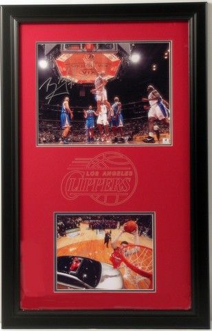 Rookie of the Year and Rookie All Star LA Clippers Blake Griffin is now an official all around star. This impressive framed display includes an oversized color photo of #32 half-way to the moon, as he deploys one of his famous dunk shots showing off his full 6 feet 10 inch frame. The photo is personally signed by Griffin. It also includes a "hoop POV" of one of his dramatic dunks. Includes the official Los Angeles Clippers logo. All professional matted, mounted and framed. Main signed photo is 14"x11", second photo is 8"x10", and the frame is approx 23"x32".