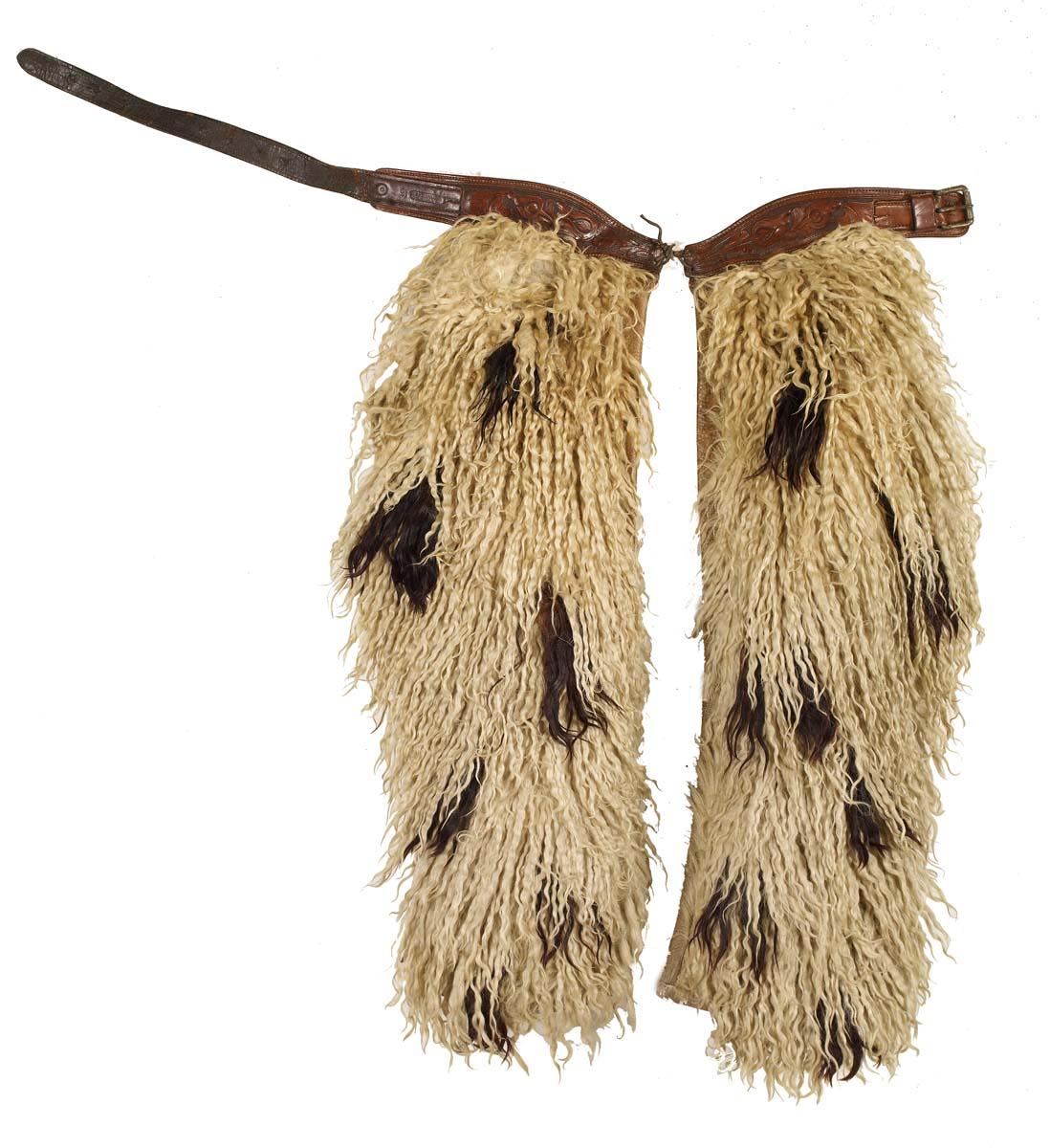 Canvas lined, leather backed, black & white pinto chaps with inside pockets, 36" long, floral carved billet. Very good condition, c 1920s