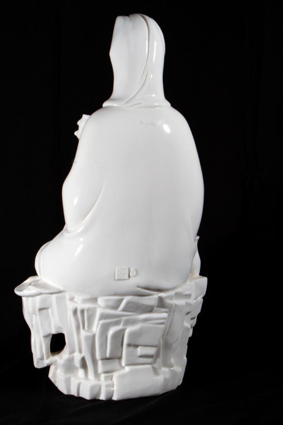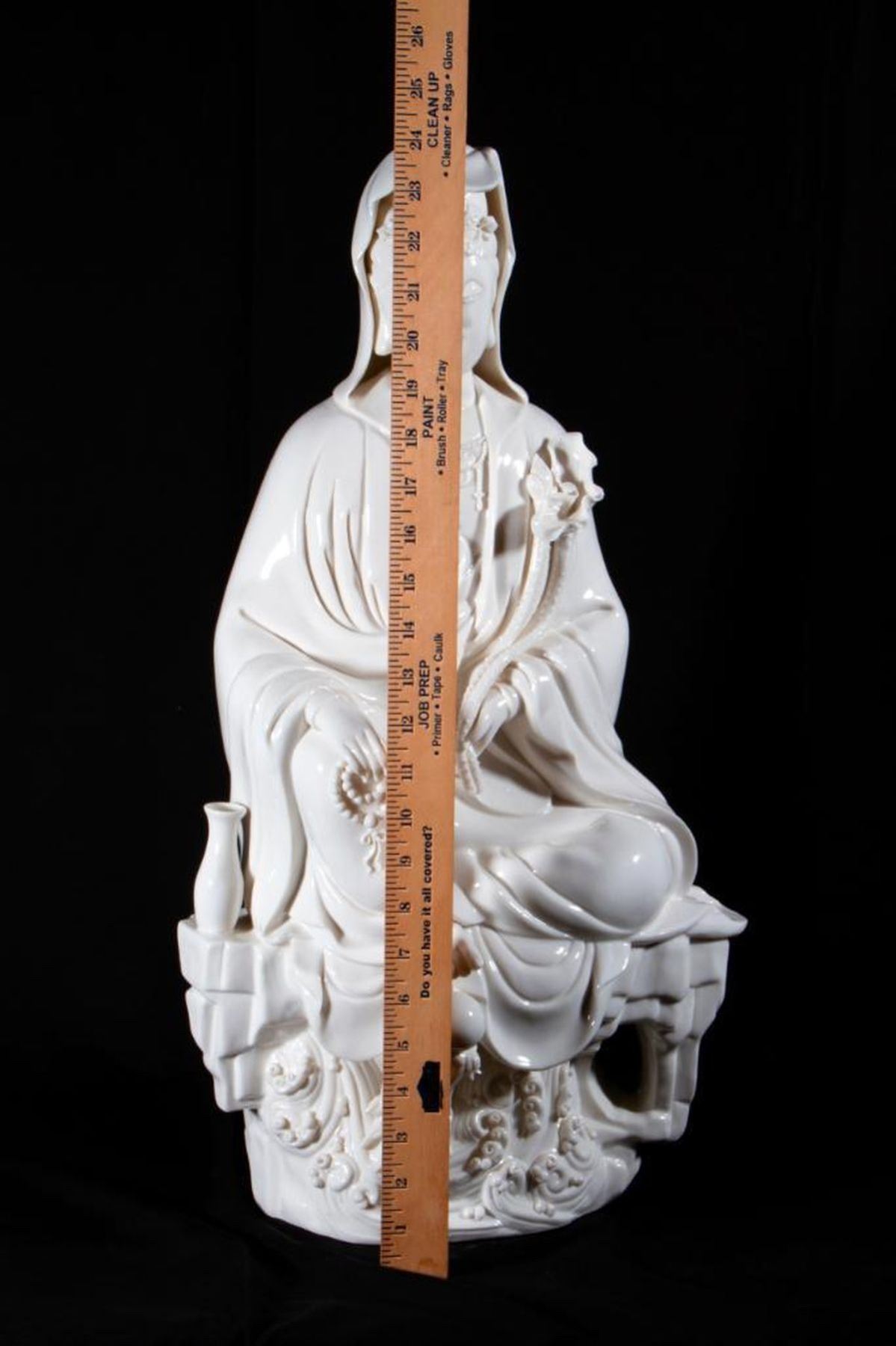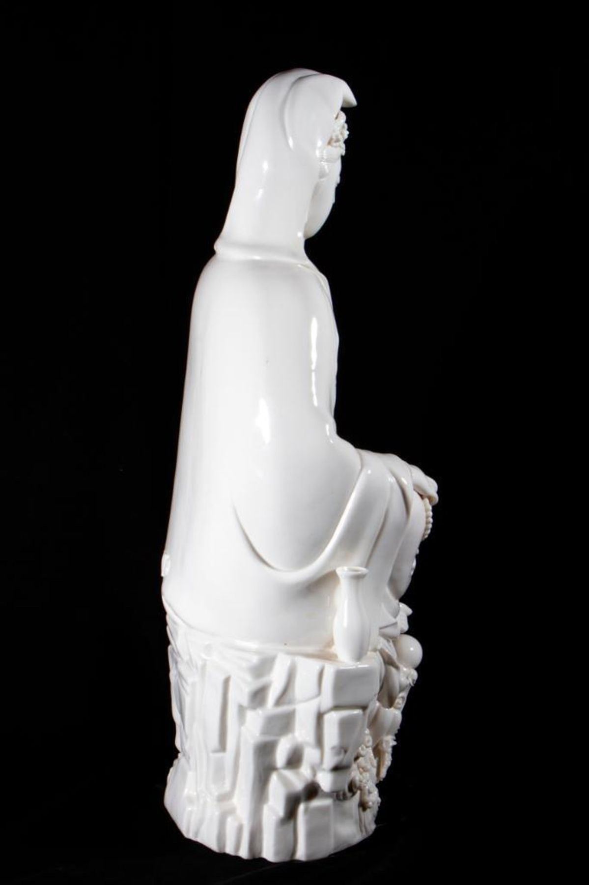A large Chinese Blanc de Chine porcelain seated Quan Yin. H - 24: W - 13" D - 7". Condition: Good.