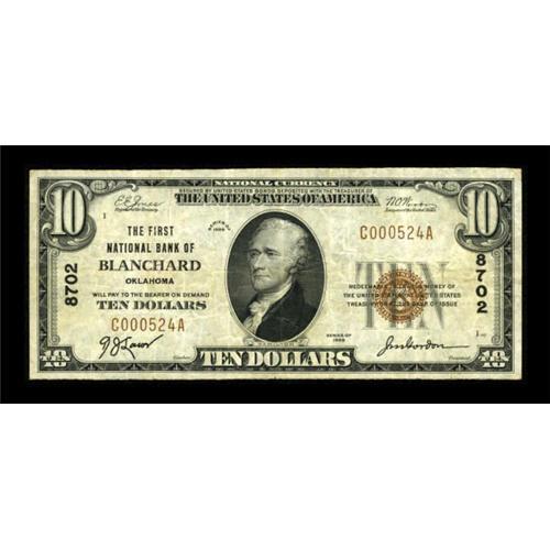 <B>Blanchard, OK</B></I> - $10 1929 Ty. 1 <B>The First NB</B></I> Ch. # 8702<BR> A problem free small example from the sole issuer in this rural central Oklahoma community. <B>Fine-Very Fine</B></I> or a bit better, and tied with one other note for the finest reported Series 1929 note from this location. <BR><BR><b>Shipping:</b> Coins & Currency (<a target="_blank" href="http://www.heritageauctions.com/common/shipping.php">view shipping information</a>)