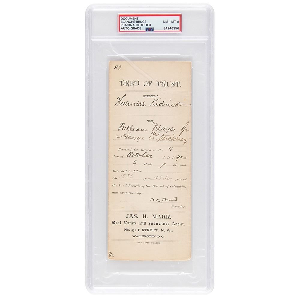 Partly-printed DS, signed "B. K. Bruce," one page, 3.5 x 8.5, October 4, 1890. Deed for a transaction between Harriett Kidrick and William Mayse, Jr,., and George W. Stickney, signed on the docketing panel by Bruce as recorder of deeds. In fine condition. Encapsulated and graded by PSA/DNA as "NM-MT 8."