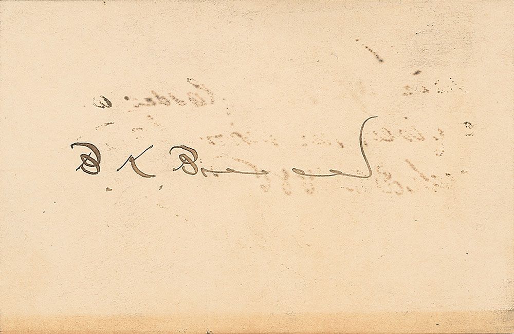 African-American politician (1841–1898) who represented Mississippi as a Republican in the US Senate. Ink signature, “B. K. Bruce,” on an off-white 4 x 2.5 card. In very good condition, with scattered ink transfer marks, a band of toning to the lower border, and mounting remnants to reverse from previous display in a scrapbook.