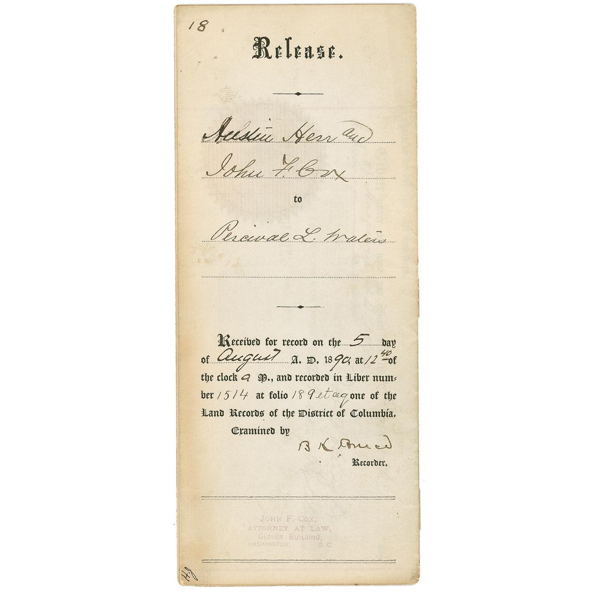 African-American politician (1841–1898) who represented Mississippi as a Republican in the US Senate. DS, signed “B. K. Bruce,” one page both sides, folded to 3.5 x 8.5, August 5, 1890. Signed release in his capacity as District of Columbia recorder of deeds. In very good condition, with separation along the folds, and light toning to edges.