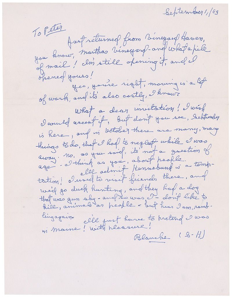 ALS signed “Blanche,” one page, 8.5 x 11, September 11, 1983. A letter declining an invitation to Maine. In part: “I’ll admit, Kennebunk is a temptation! I used to visit friends there, and we’d go duck hunting. and they had a dog that was gun shy—and so was I—don’t like to kill, animals or people—but hear [sic] I am, rambling again. I’ll just have to pretend I was in Maine!” In fine condition, with an extra pair of horizontal folds and some light wrinkling.