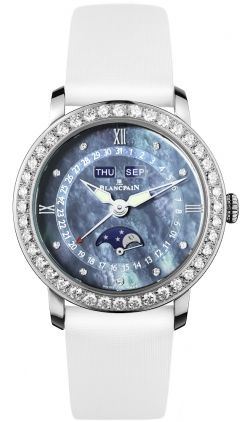 Model: 3663-4654L-52B - CASE = [Material:Stainless Steel], [Case Diameter:35], [Case Thickness:10.57mm], [Bezel:Diamonds on Bezel], [Case Back:See-thru Sapphire Crystal], [Water Resistant:50 Meters/ 150 Feet], [Crystal:Scratch Resistant Sapphire], DIAL = [Color:Blue Mother of Pearl], MOVEMENT = [Type:Automatic Self Winding], BAND = [Clasp:Deployment], [Type:White Satin], (Usually ships in 1 to 2 weeks.)