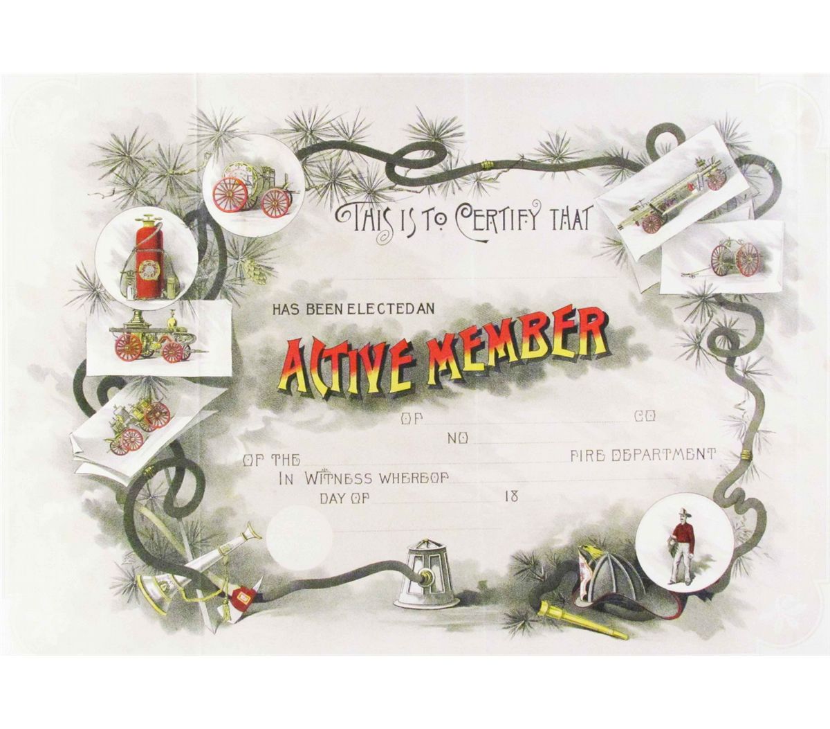 Blank Active Member Fire Department Certificate. Near Mint. Approx. 24 X 16 inches.