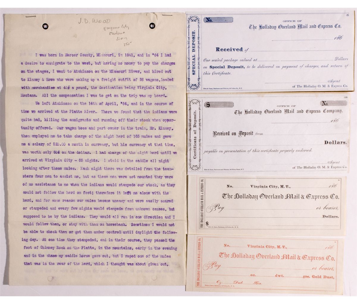 Four blank checks from the Holladay Overland Mail & Express Co. Office in Virginia City, M.T. Produced by Slote & James, Stationers and Printers, 93 Fulton St., N.Y. Checks are dated is 186_. Also included, a six-(legal sized) page diary transcriptions from a pioneer named J.D. Wood. It begins: "I was born in Mercer County, Missouri, in 1841, and in '64 I had a desire to emigrate to the west, but having no money to pay the charges on the stages, I went to Atchinson on the Missouri River, and hired out to Kinney & Howe…" Arriving at the Platte River "we found that the Indians were quite bad, killing the emigrants and running off their stock when opportunity offered." -59106