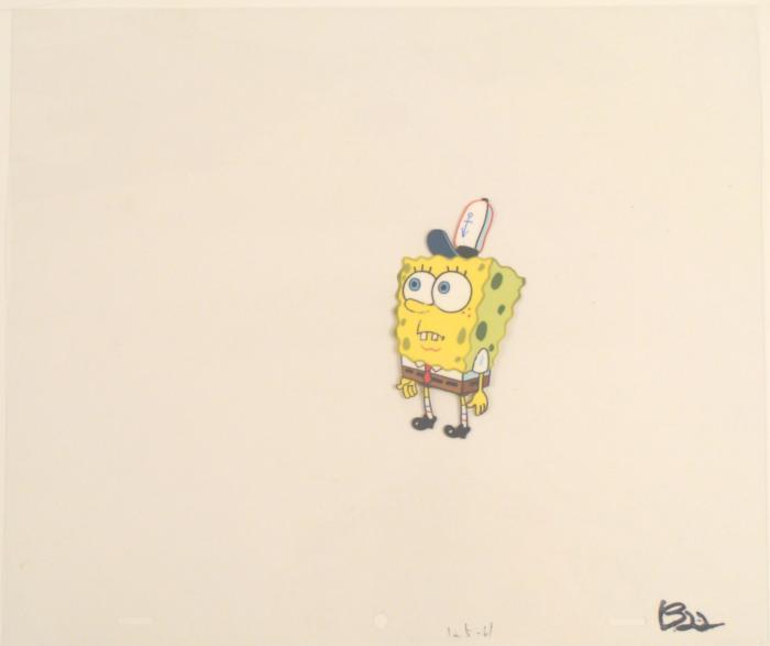 To create production cels, the original animator's drawing is transferred onto an acetate cel (by hand-inking and/or photo copying). The cel is then hand-painted on the reverse side. The cel received by the winning bidder may be ever so slightly different from the one in the auction photos. The cel is ready to be matted and framed. The animator's notations are at the bottom of the cel. There is some slight paint fade to SpongeBob's outline.