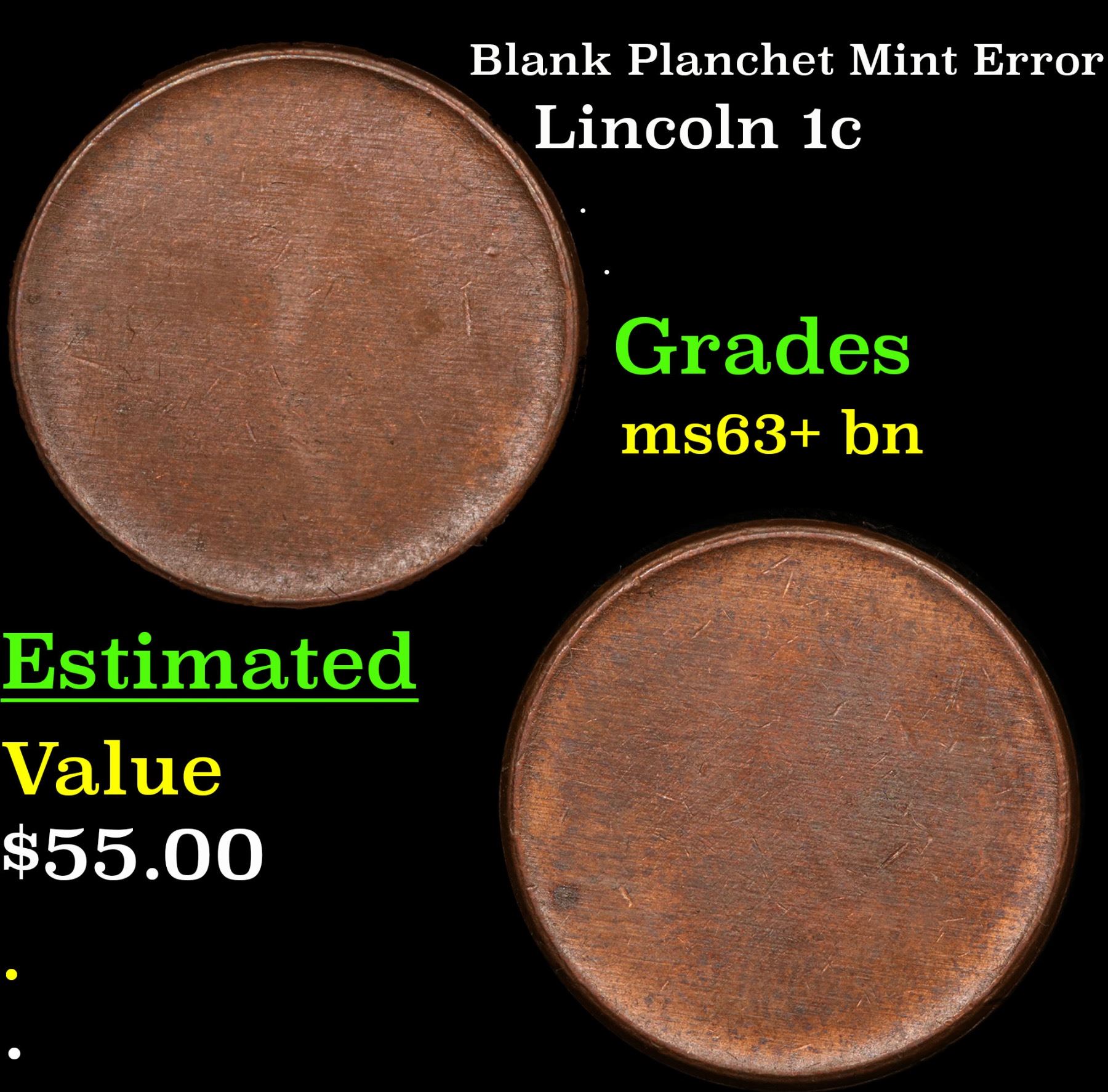 Blank Planchet Mint Error Lincoln Cent 1c Grades Select+ Unc BN.