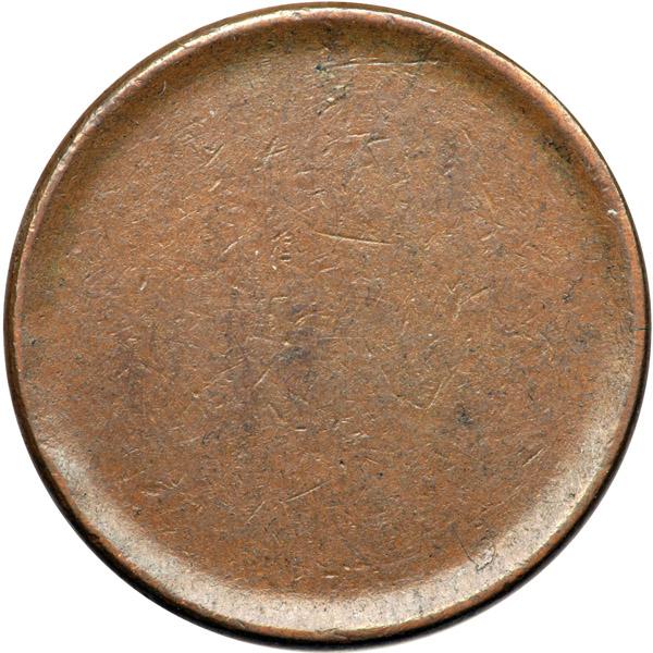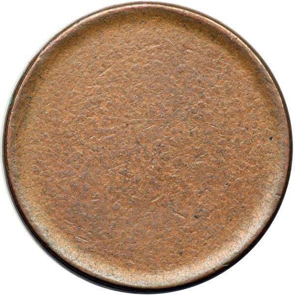 Blank Planchet with Narrow Upset Rims, Stage II, AU50. Glossy medium brown and light chocolate. No defects other than the usual tiny planchet chips that normally disappear when properly struck by the dies. The rims are upset and fairly narrow. Most likely made for the 1849-57 Coronet half cents rather than the earlier dates that have a very slightly larger diameter. Diameter 22.5 millimeters and weight 83.1 grains versus the standard of 84.0 grains. Davy #58.1.1.