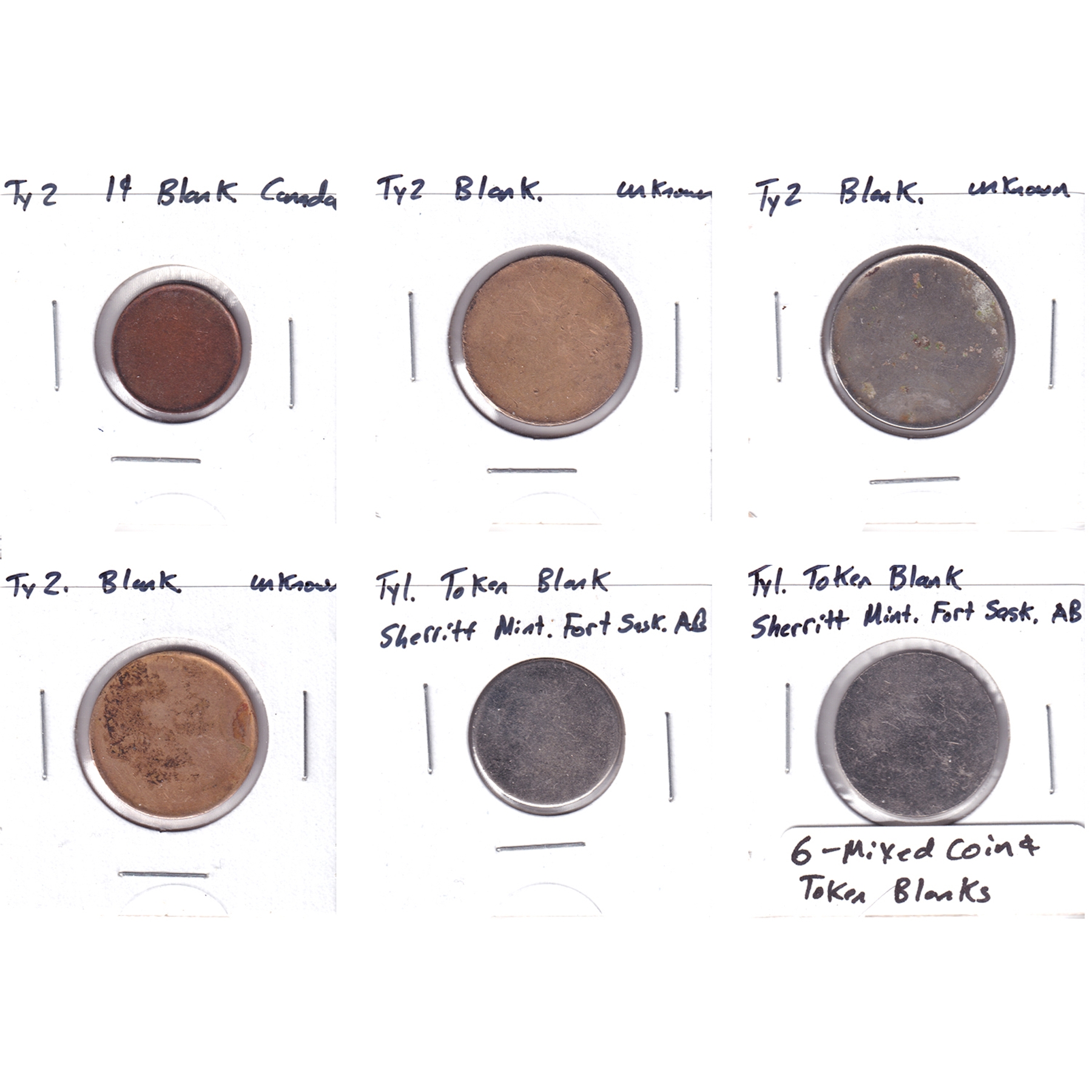INCLUDES: 1-cent Type 2 Blank, 3x Type 2 Unknown Blank, & 2x Sherriff Mint Fort Sask-AB Type 1 Token Blank.