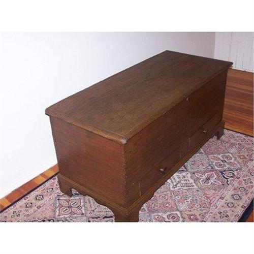 Early 19th C. Pennsylvania-Ohio area Two Drawer Blanket Chest. Circa 1830-1850. Solid pine 3/4-1 inch thick hand hewn boards with wood-peg construction on four sides. Fine dovetail joinery on all bracket feet and sides of trunk (13 full dovetails on each side of trunk with four dovetails carved on each bracket foot). Both drawers dovetailed on all sides as well; two older wrought iron hinges support top board that has replaced original hinges (darker oxidized shadows show where original hinges were set in top). Wooden pegs secure the 1" - 1 1/4" wide wood trim that frames the front and sides of top board. Wonderful older medium-dark walnut color finish throughout entire exterior; inside immigrant drawer measures 5" wide by 19" in length. Center middle lock is missing for top section of chest.