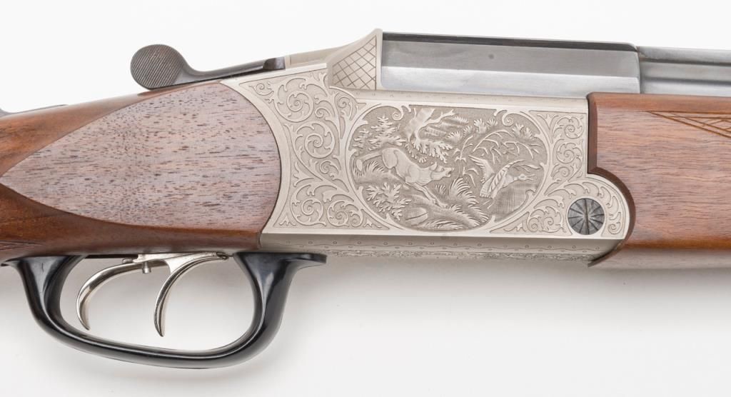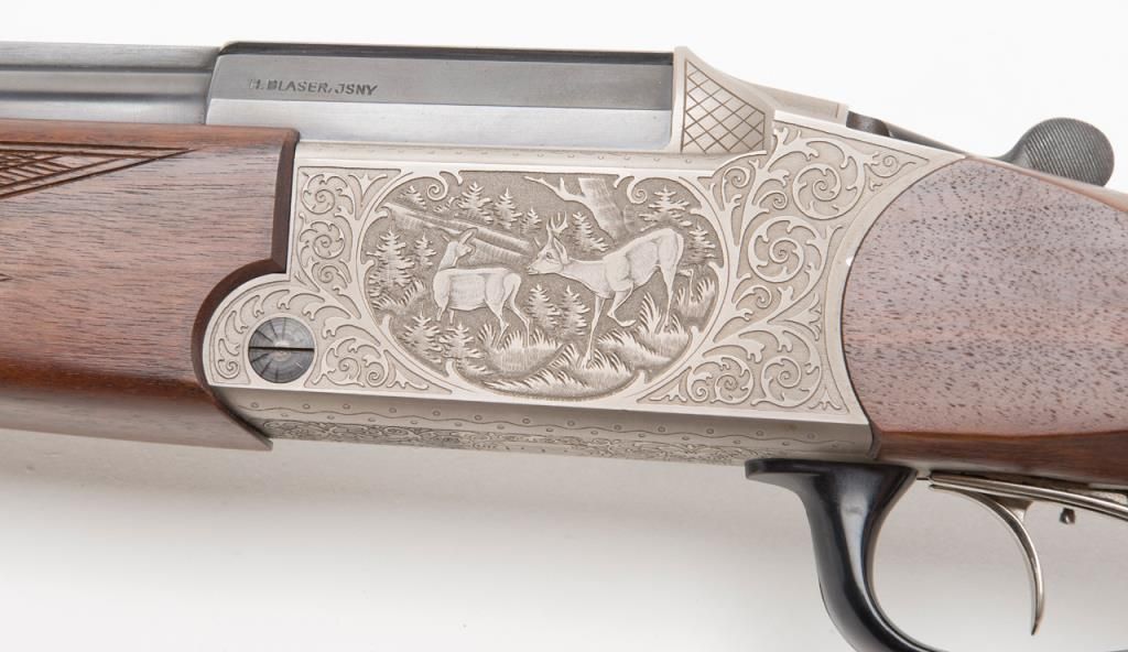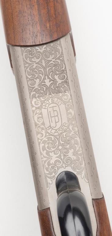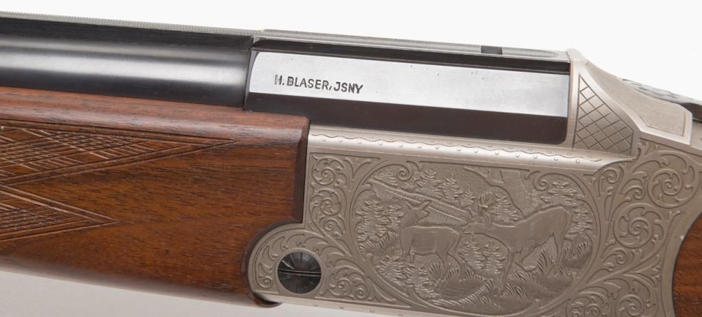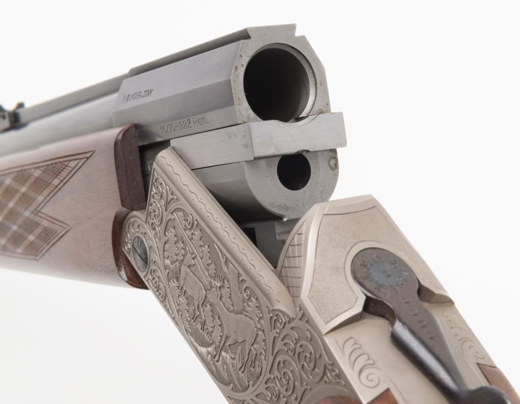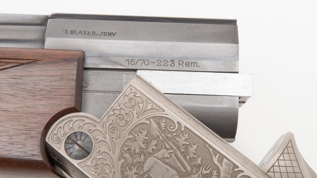 Blaser Over/Under Combination Shotgun/Rifle, 16 Gauge and .223 Remington caliber, Serial #06693. The gun is in overall excellent condition with 23 ¾” blued barrels showing little or no use. The barrels show nearly all of their original bluedfinish with a full-length filed rib and express sights. The action is finished in French Grey with wonderful scroll and game scene engraving. The finely checkered wood stocks are in excellent condition showing only minor handling marks. Thestocks feature sling swivels, black plastic butt plate and Bavarian style beaded cheekpiece and hogback butt stock with a 14 ¼” LOP. The bores are excellent, the action crisp and markings sharp on this lightly used Blaser. (Modern/PPT).Est.: $2,000-$4,000.