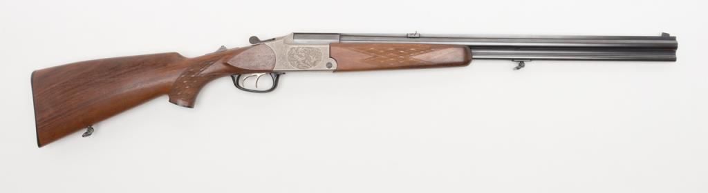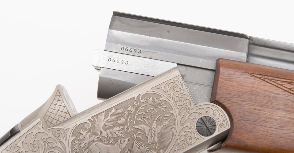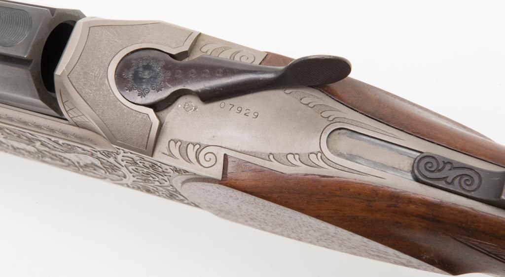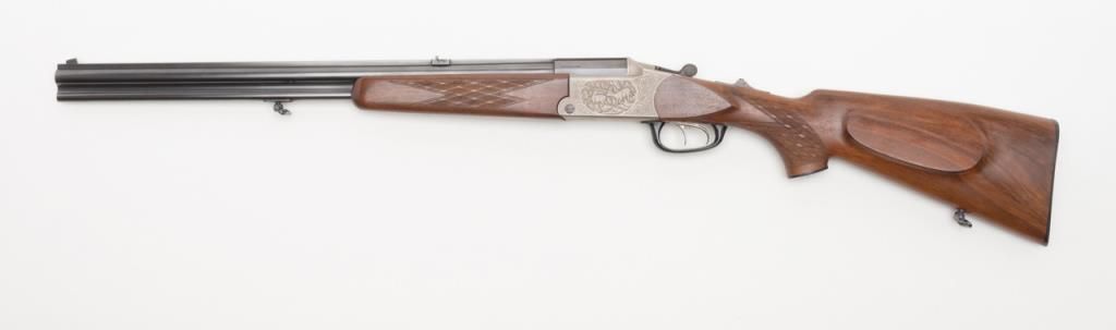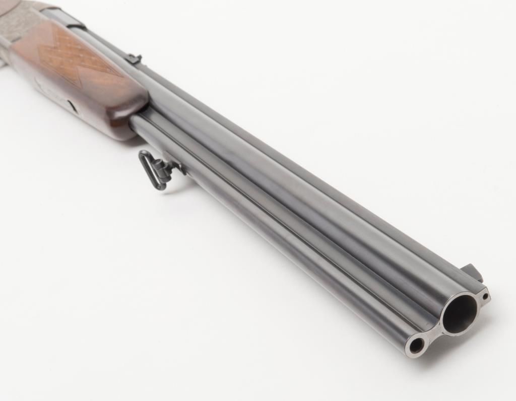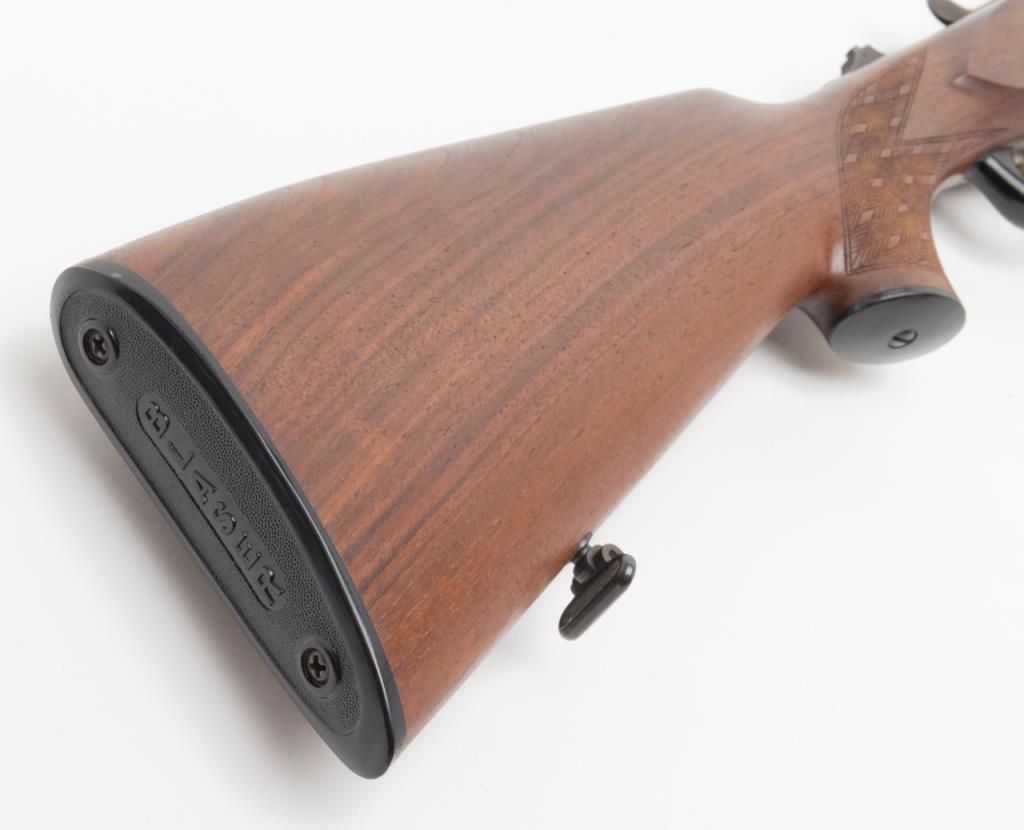 Blaser Over/Under Combination Shotgun/Rifle, 16 Gauge and .223 Remington caliber, Serial #06693. The gun is in overall excellent condition with 23 ¾” blued barrels showing little or no use. The barrels show nearly all of their original bluedfinish with a full-length filed rib and express sights. The action is finished in French Grey with wonderful scroll and game scene engraving. The finely checkered wood stocks are in excellent condition showing only minor handling marks. Thestocks feature sling swivels, black plastic butt plate and Bavarian style beaded cheekpiece and hogback butt stock with a 14 ¼” LOP. The bores are excellent, the action crisp and markings sharp on this lightly used Blaser. (Modern/PPT).Est.: $2,000-$4,000.