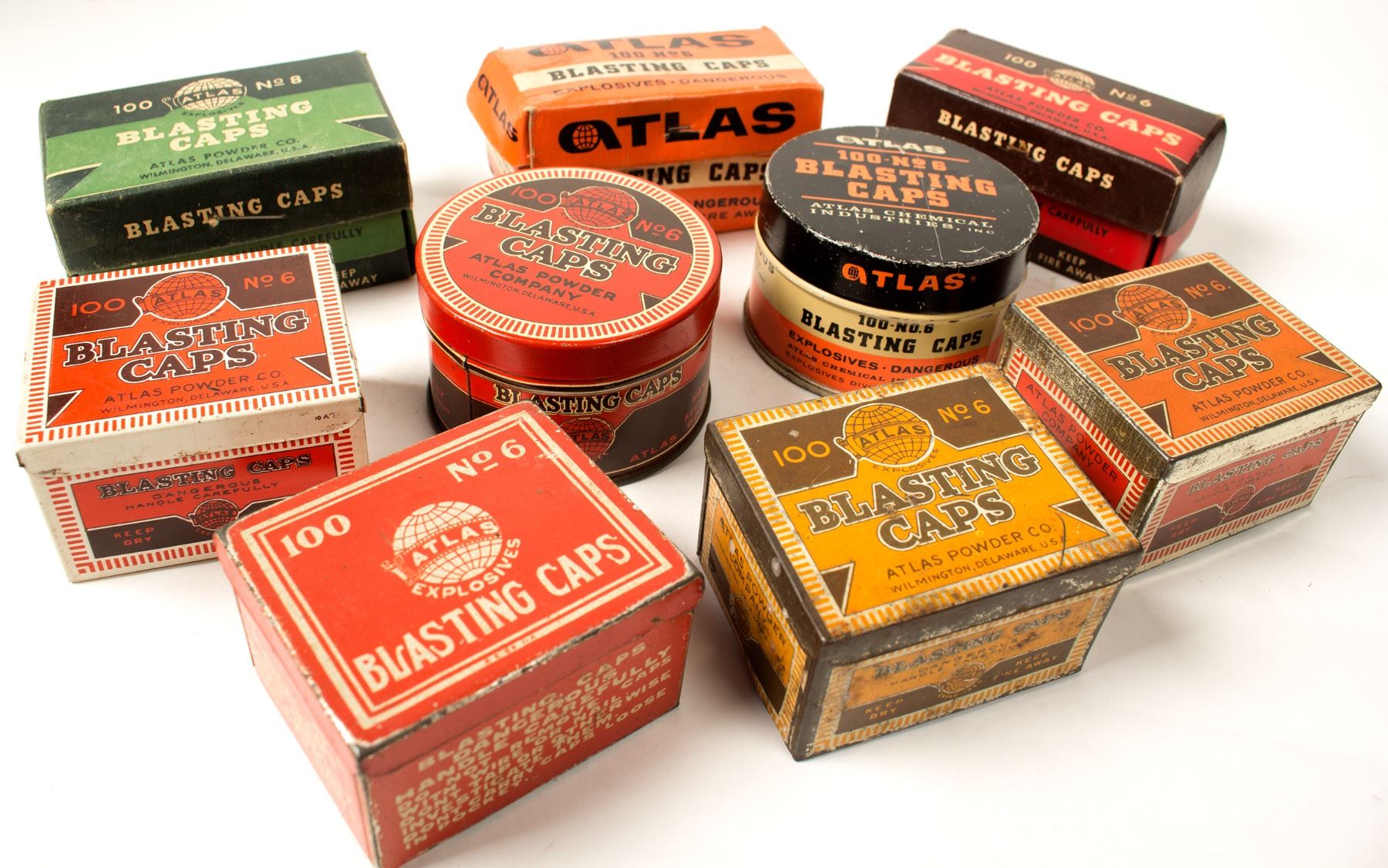 Atlas blasting cap tin collection. Nine different. Includes four rectangular tins, two round tins, three cardboard tins. State: City: HWAC#: 46866 Date: