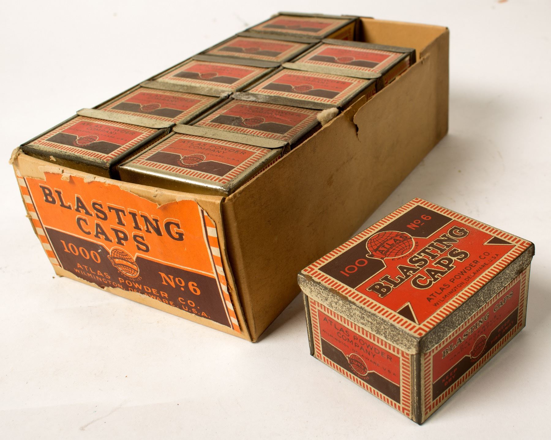 Original box full of 10 atlas powder rectangular orange tins. Excellent. State: City: HWAC#: 46873 Date: