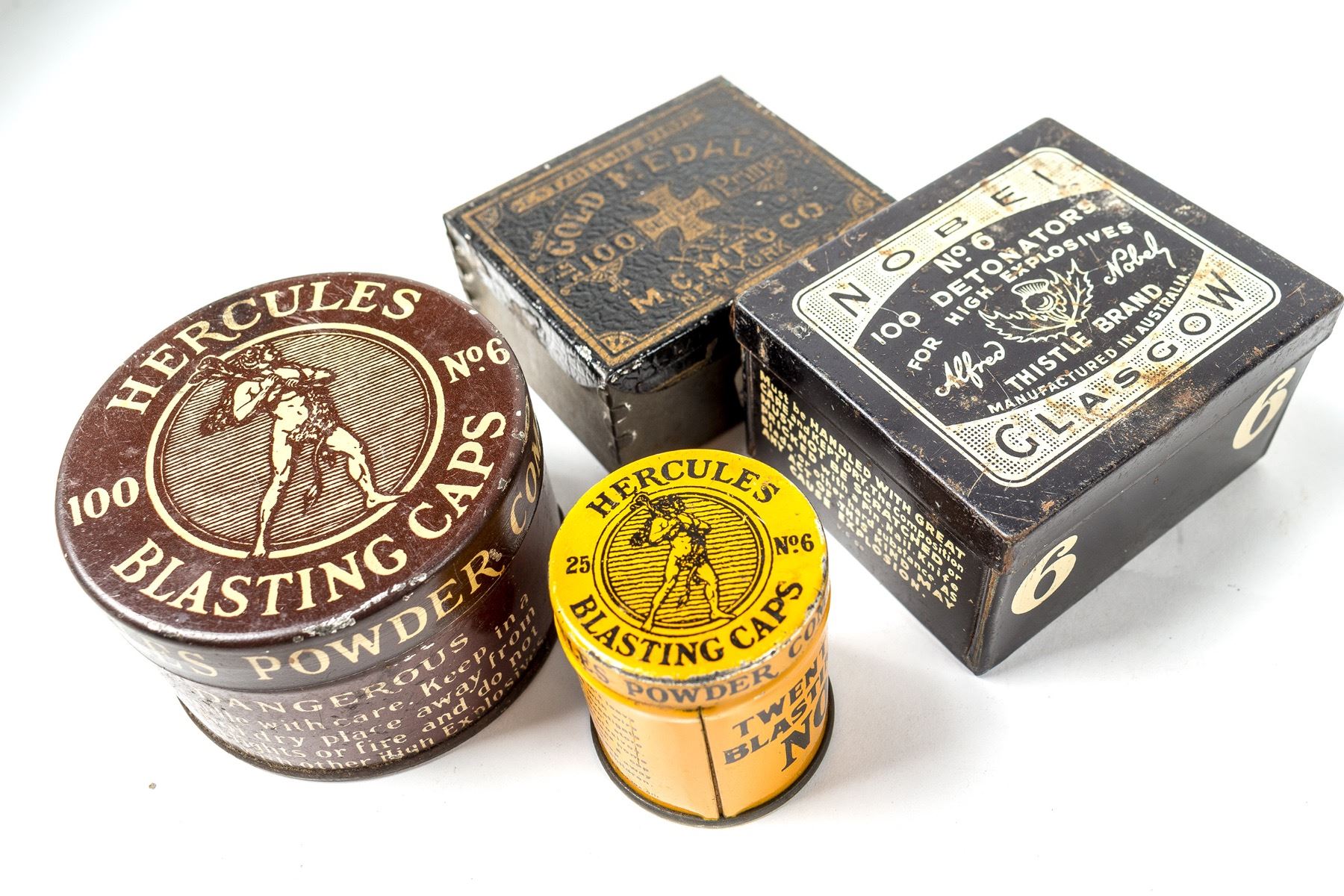 Small collection of scarce blasting cap tins. 1) Hercules 25 count small round. 2) Hercules 100 count brown round. 3) Nobel 100 count blue rectangle. 4) Gold metal 100 count in Boston and painted rectangular. State: City: HWAC#: 46863 Date: