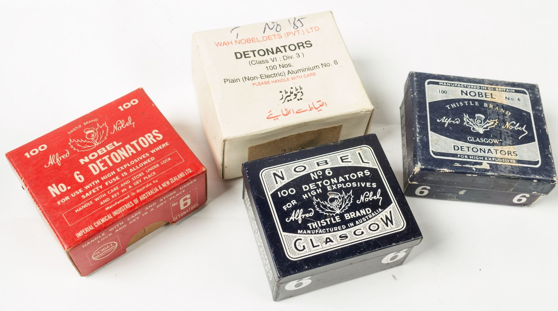 Four different Nobel cap tins. The best is a mint condition blue paint square tin, followed by three different cardboard tins, red, blue, and white. Nice collection. State: City: HWAC#: 46864 Date: