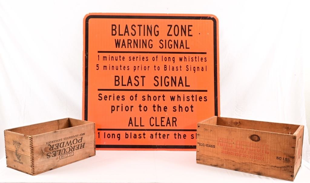 (2) Dynamite wooden crates . Sign is reflective metal 36" x 36".