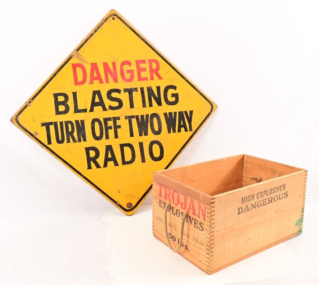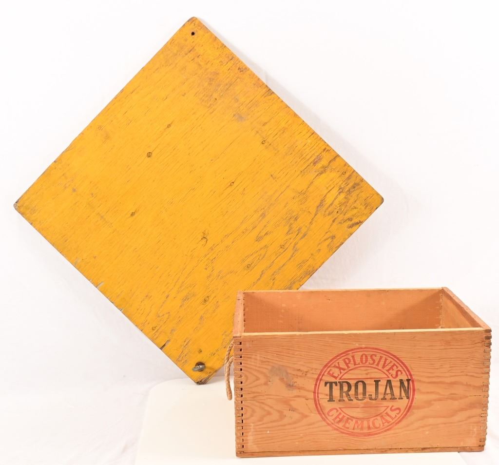 "Trojan Brand" wooden dynamite crate. Hand Painted Wood Blasting area sign 24" x 24".