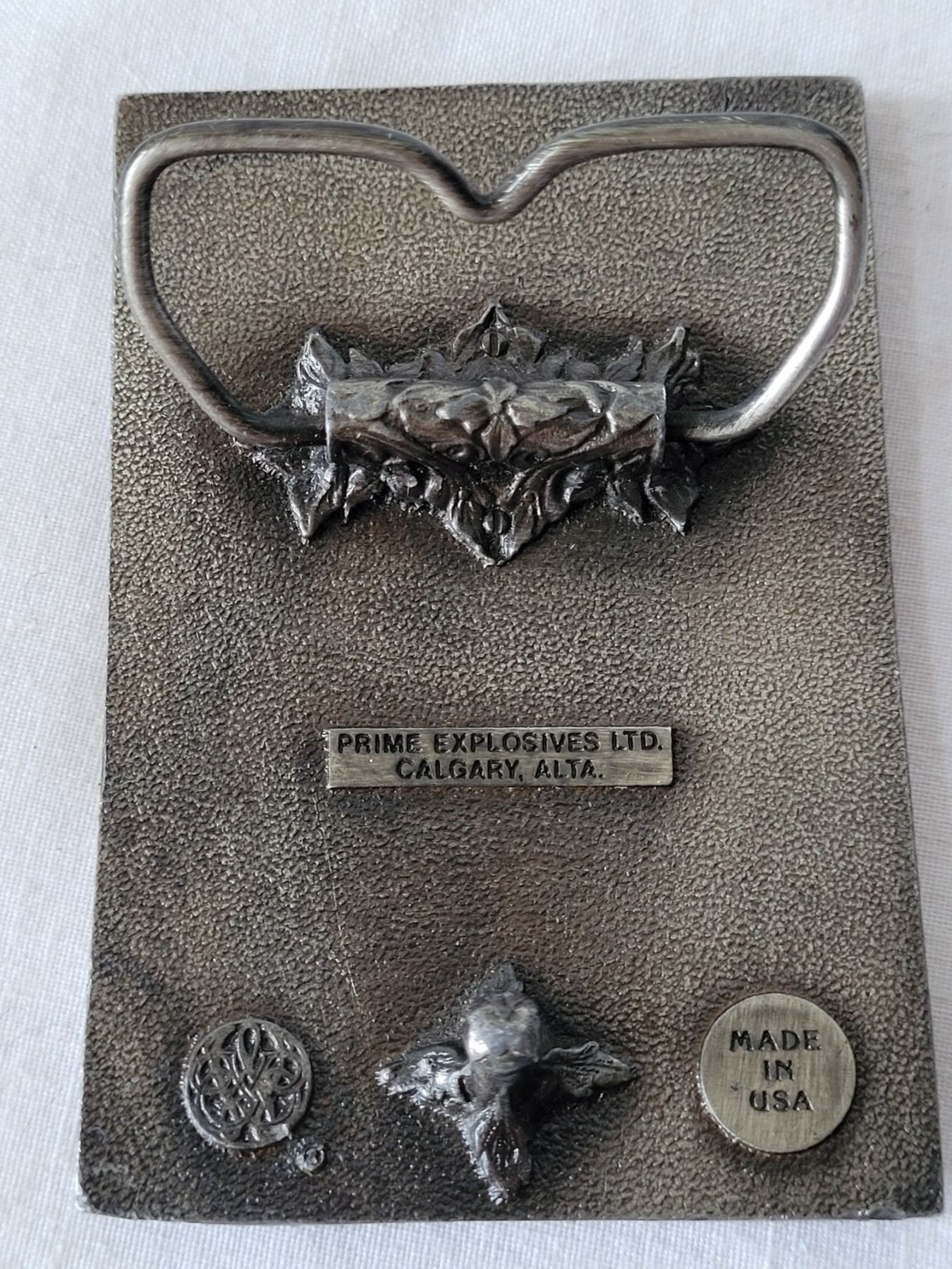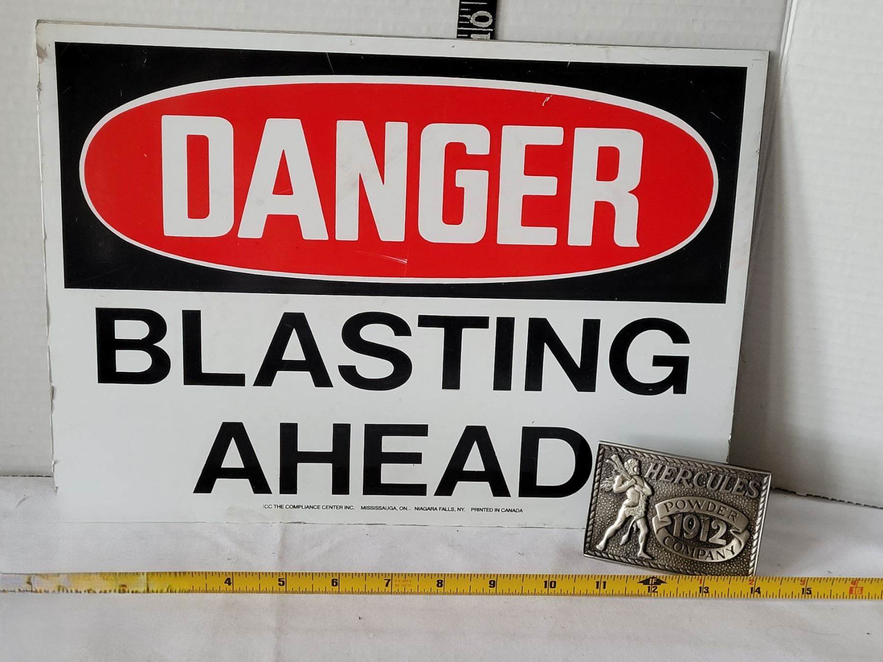 Blasting sign & Hercules Powder belt buckle. Prime Explosives. Calgary, Alta.