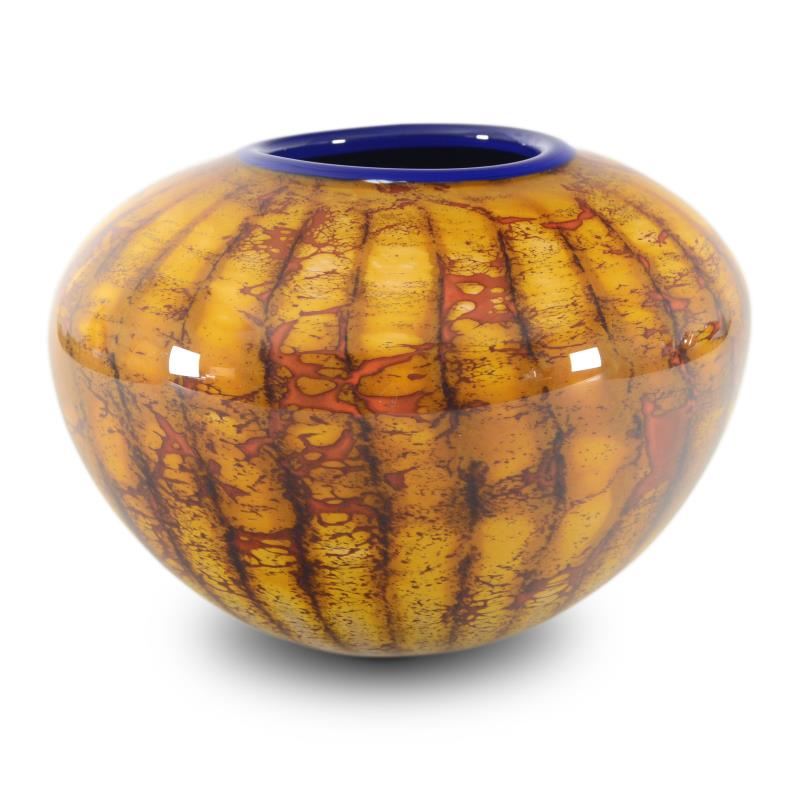 This hand blown "Small Blatik Sphere" sculpture combines sand-etched exteriors with an elegant lip accent and is hand signed by GartnerBlade Glass. Measures approx. Measures approx. 7.5" (diameter) x 5" (height); 2 lbs. (weight).