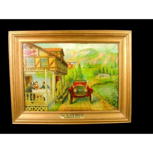 Val Blatz Brewing Co., Milwaukee, USA Canvas Sign. Oleogragh, artist R. Bohnet dated 1913 in original frame. Great subject matter. We have not seen this one. Some minor discoloration top and bottom otherwise excellent condition. 34 1/2 X 26 1/2 inches overall.