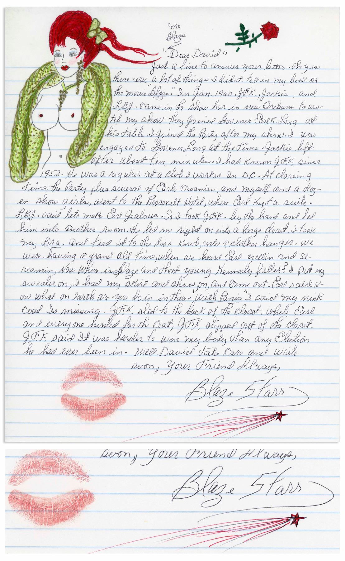 Autograph letter signed by infamous burlesque dancer Blaze Starr, who had once been engaged to Louisiana Governor Earl Long. Here, Blaze recounts a tryst with John F. Kennedy: '''Dear David' Just a line to answer your letter. Oh yes, there was a lot of things I didn't tell in my book or the movie 'Blaze.' In Jan. 1960 J.F.K., Jackie, and L.B.J. came in the Show Bar in New Orleans to watch my show. They joined Governor Earl K. Long at his table. I joined the party after my show. I was engaged to Governor Long at the time. Jackie left after about ten minutes. I had known J.F.K. since 1952. He was a regular at a club I worked in D.C. At closing time, the party plus several of Earls cronies, and myself and a dozen show girls, went to the Roosevelt Hotel, where Earl kept a suite. L.B.J. said lets make Earl jealous. So I took J.F.K. by the hand and led him into another room. He led me right on into a large closet. I took my Bra, and tied it to the door know, onto a clothes hanger. We were having a grand old time, when we heard Earl yellin and screamin, Now where is Blaze and that young Kennedy feller? I put my sweater on, I had my skirt and shoes on, and came out. Earl said now what on earth are you doing in there? 'With panic' I said my mink coat is missing. J.F.K. slid ot the back of the closet. While Earl and everyone hunted for the coat, J.F.K. slipped out of the closet. J.F.K. said it was harder to win my body than any election he had ever been in...Blaze Starr''. 8.5'' x 11'' letter is adorned with a self-portrait sketch and a lipstick kiss. Near fine condition. Accompanied by 8'' x 10'' signed topless photo of Blaze.