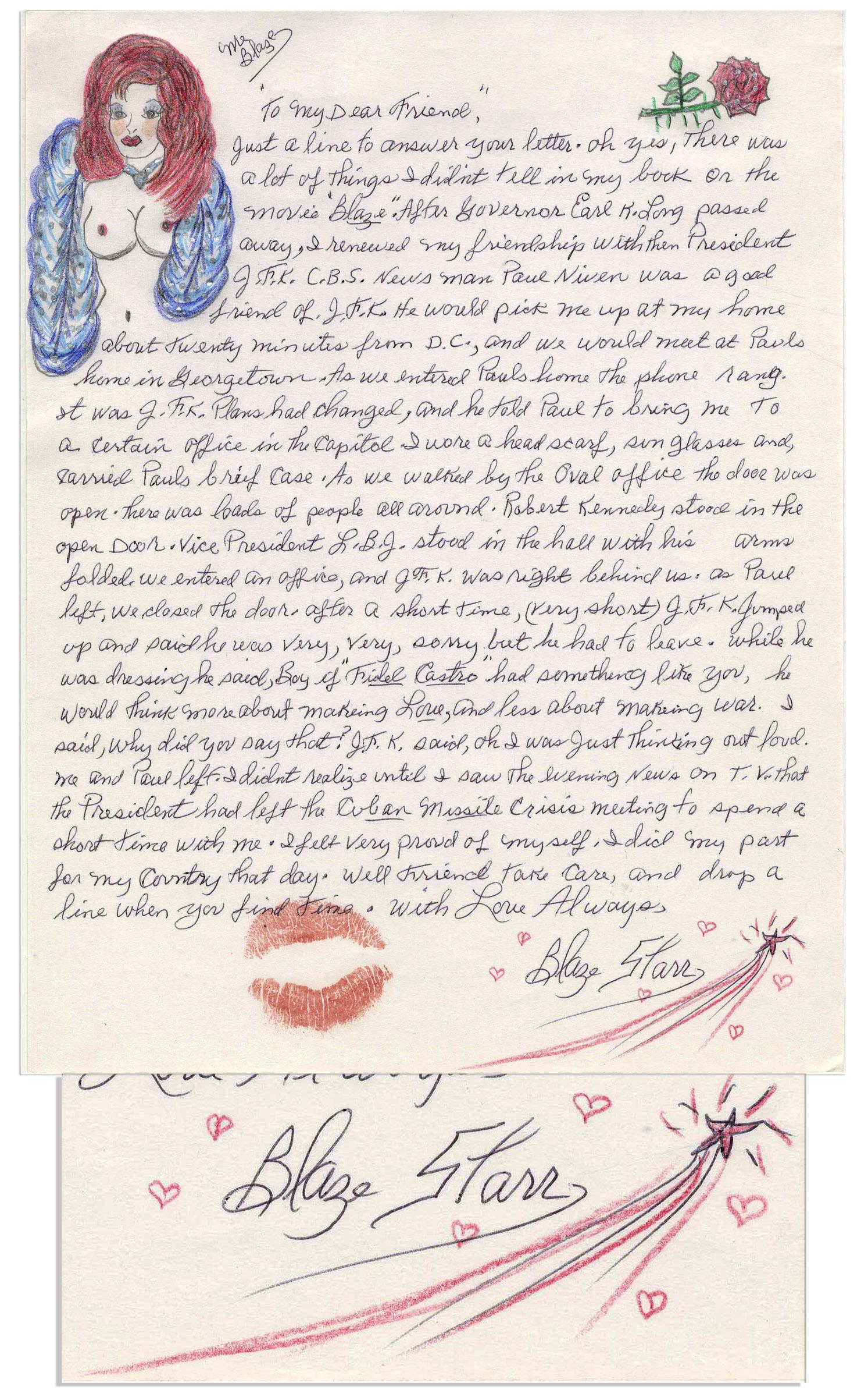 Blaze Starr autograph letter signed, writing of President John F. Kennedy taking a break from the tense 13 days of negotiations during the Cuban Missile Crisis. Colorful letter reads in full, ''…Just a line to answer your letter. Oh yes there was a lot of things I didn't tell in my book or the movie 'Blaze.' After Governor Earl K. Long passed away I renewed my friendship with then president J.F.K. C.B.S. newsman Paul Niven was a friend of J.F.K. he would pick me up at my home, about twenty minutes from D.C., and we would meet at Paul's home in Georgetown. As we entered Paul's home the phone rang. It was J.F.K. Plans had changed and he told Paul to bring me to a certain office in the Capitol. I wore a head scarf, sunglasses, and carried Paul's briefcase. As we walked by the Oval Office the door was open. There was loads of people all around. Robert Kennedy stood in the open door. Vice President L.B.J. stood in the hall with his arms folded. We entered an office and J.F.K. was right behind us. As Paul left we closed the door. After a short time, (very short), J.F.K. jumped up and said he was very, very, sorry but he had to leave. While he was dressing he said Boy, if Fidel Castro had something like you, he would think more about making Love, and less about making war. I said, why did you say that? J.F.K. said oh, I was just thinking out loud. Me and Paul left I didn't realize until I saw the evening news on T.V. that the President had left the Cuban Missile Crisis meeting to spend a short time with me. I felt very proud of myself I did my part for my country that day. Well friend take care and drop a line when you find time…'' Signed ''Blaze Starr''. Letter is adorned with a nude self-portrait and lipstick kiss by Blaze Starr. Single page 8.5'' x 11'' letter is in fine condition.