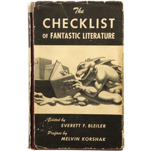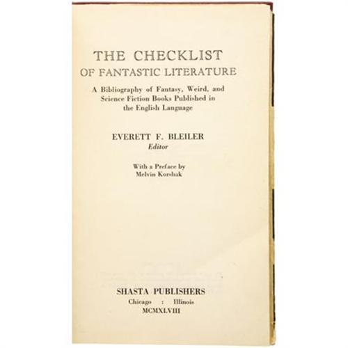 <B>Everett F. Bleiler, Editor. </B></I><B><I>The Checklist of Fantastic Literature</B></I></B></I><B>.</B></I> Chicago: Shasta Publishers, 1948. <BR>Twelvemo. 455 pages.<BR><BR>Maroon cloth with gilt lettering on spine. Light rubbing to spine ends and a few corners, but in overall fine condition. Textblock is very fine; former owner's signature on flyleaf. Dust jacket with Hannes Bok wraparound illustration bears old tape repairs; separated at spine with moderate wear, chipping, and small tears overall. An exhaustive bibliographical checklist of fantasy, science fiction and horror literature, including more than 5,000 books and pamphlets.<BR><BR><BR><BR><b>Shipping:</b> Books & Catalogs (<a target="_blank" href="http://www.heritageauctions.com/common/shipping.php">view shipping information</a>)