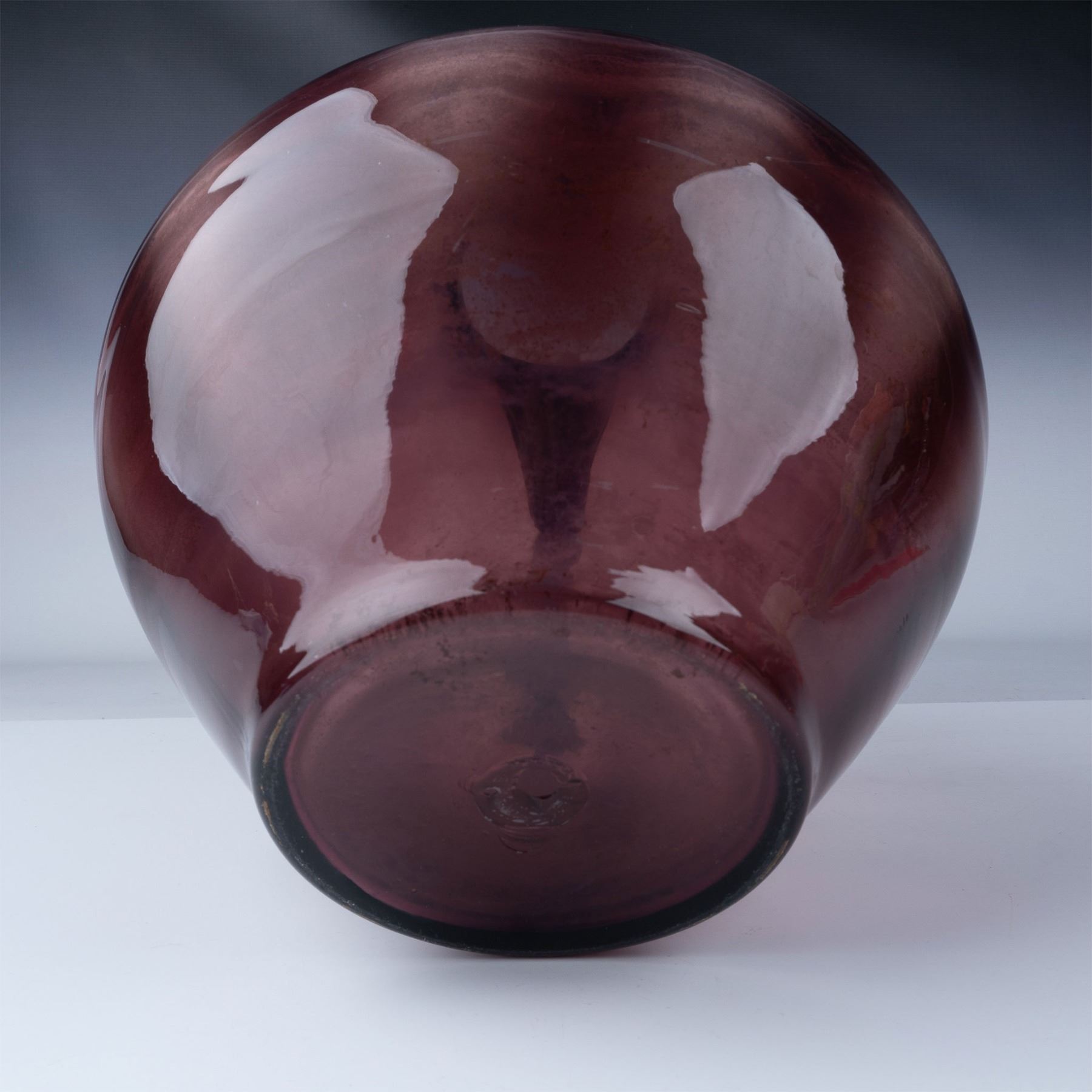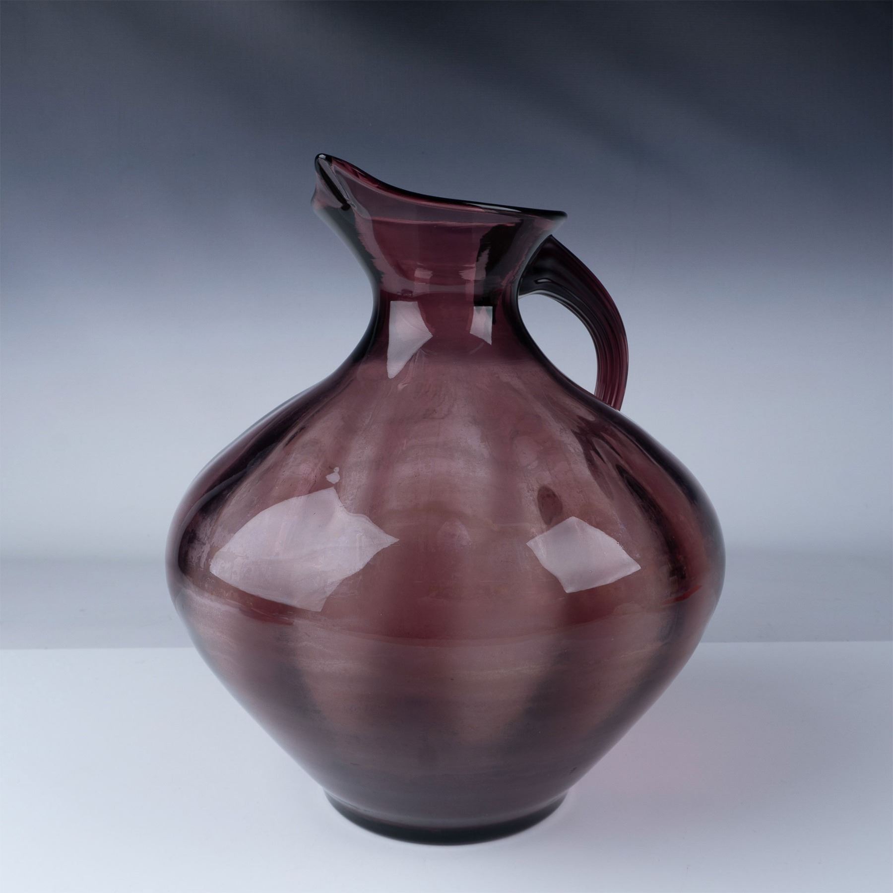 Striking Blenko optic glass pitcher in a rich amethyst hue. Featuring a hand-blown design with a bulbous body, sharp pouring spout, and applied handle, this piece showcases Blenko signature craftsmanship. The optic pattern adds depth and visual interest, highlighting the interplay of light with its vibrant color. Likely from the mid-century modern era, this pitcher is both a functional and decorative statement.