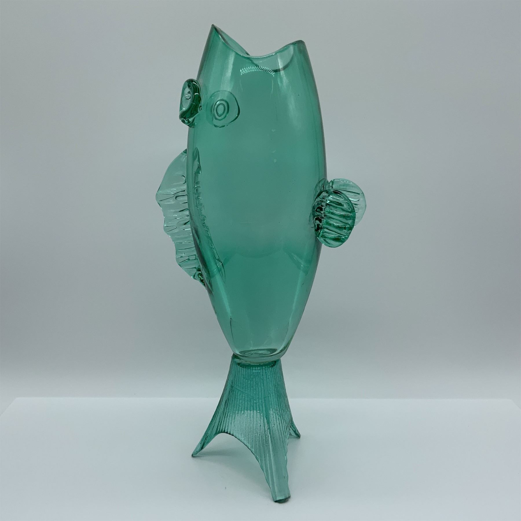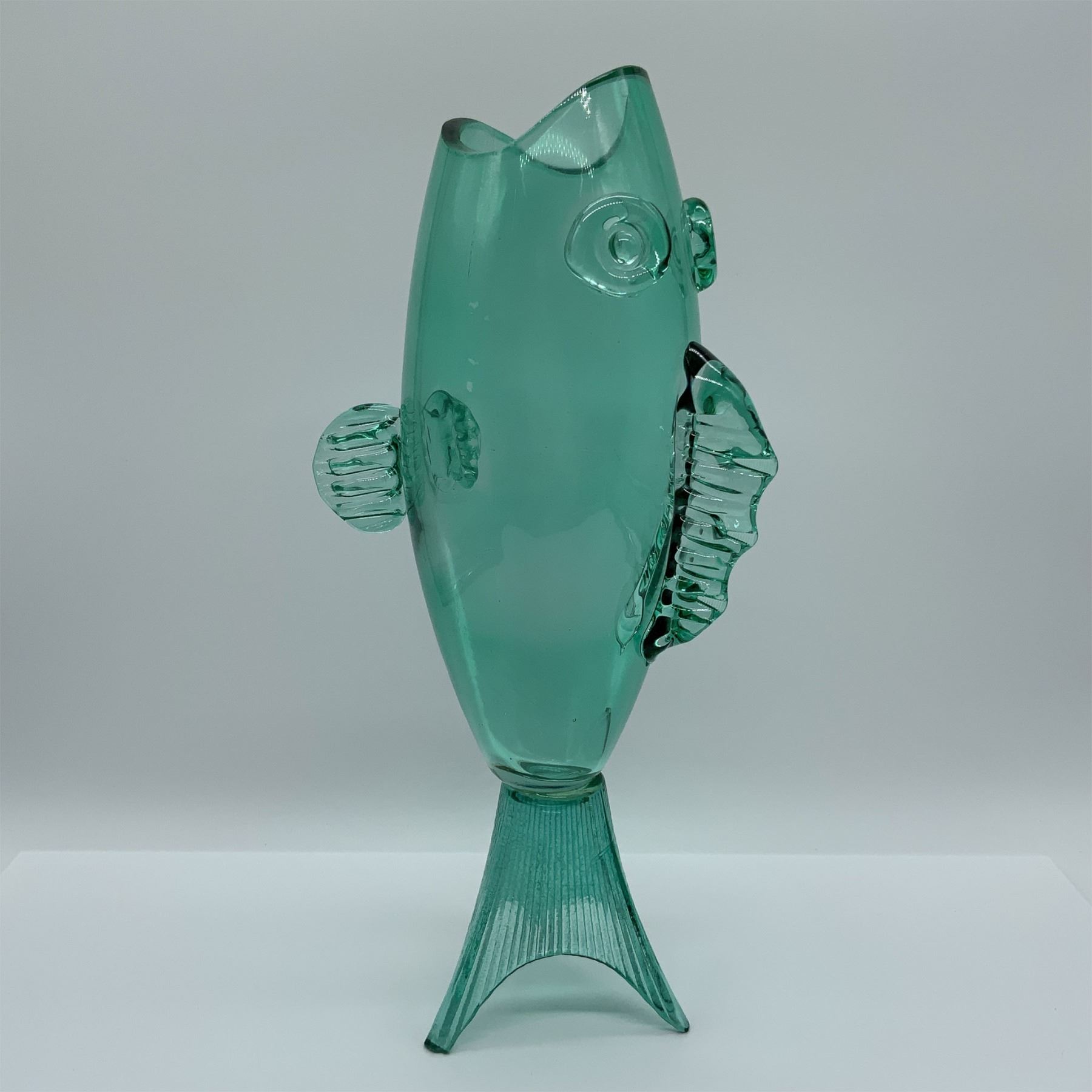 This molded art glass piece combines functionality and elegance, designed as a stylized fish-shaped vase in a striking aqua color. The open mouth of the fish serves as the vase's opening, making it suitable for holding small floral arrangements or serving as a decorative centerpiece. Intricate detailing on the fins and tail enhances the aquatic design, while the smooth surface highlights the vibrant hue. Measuring 5.75 inches in height, this unique piece is perfect for Blenko collectors or anyone seeking a whimsical yet functional accent for their home. No makers mark.