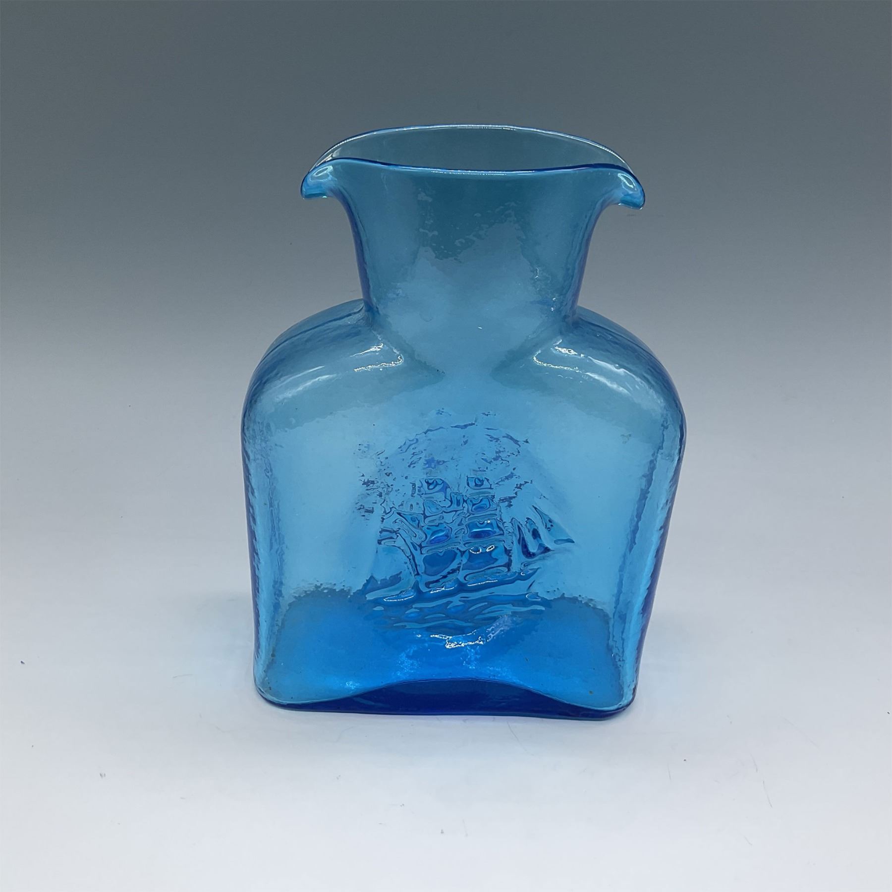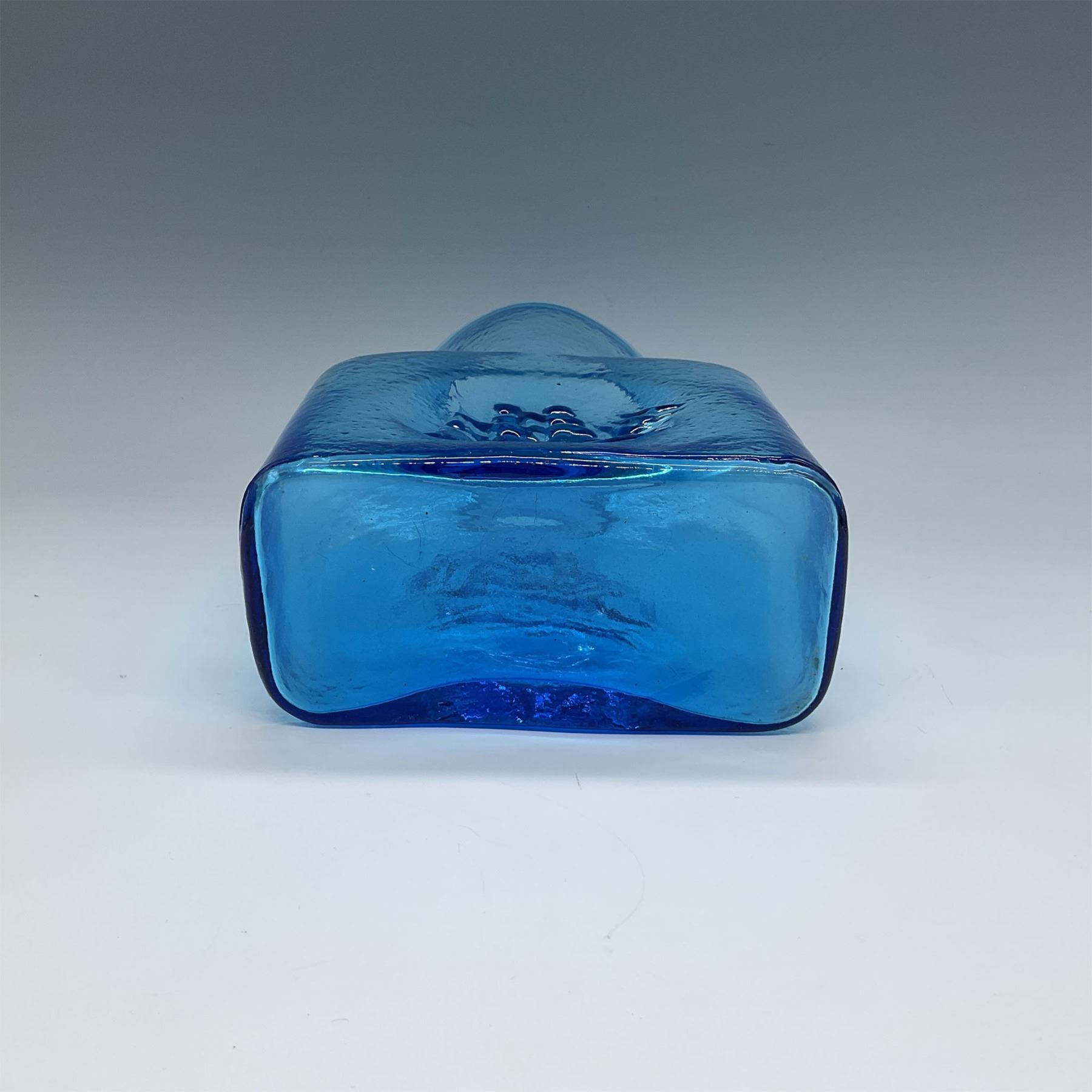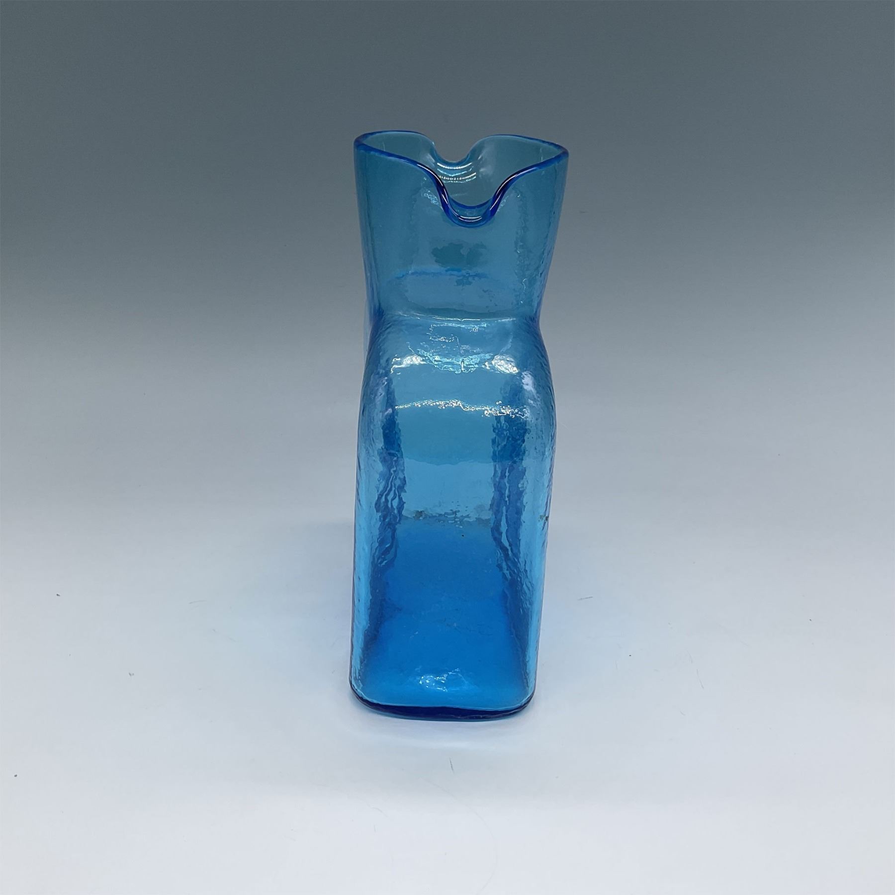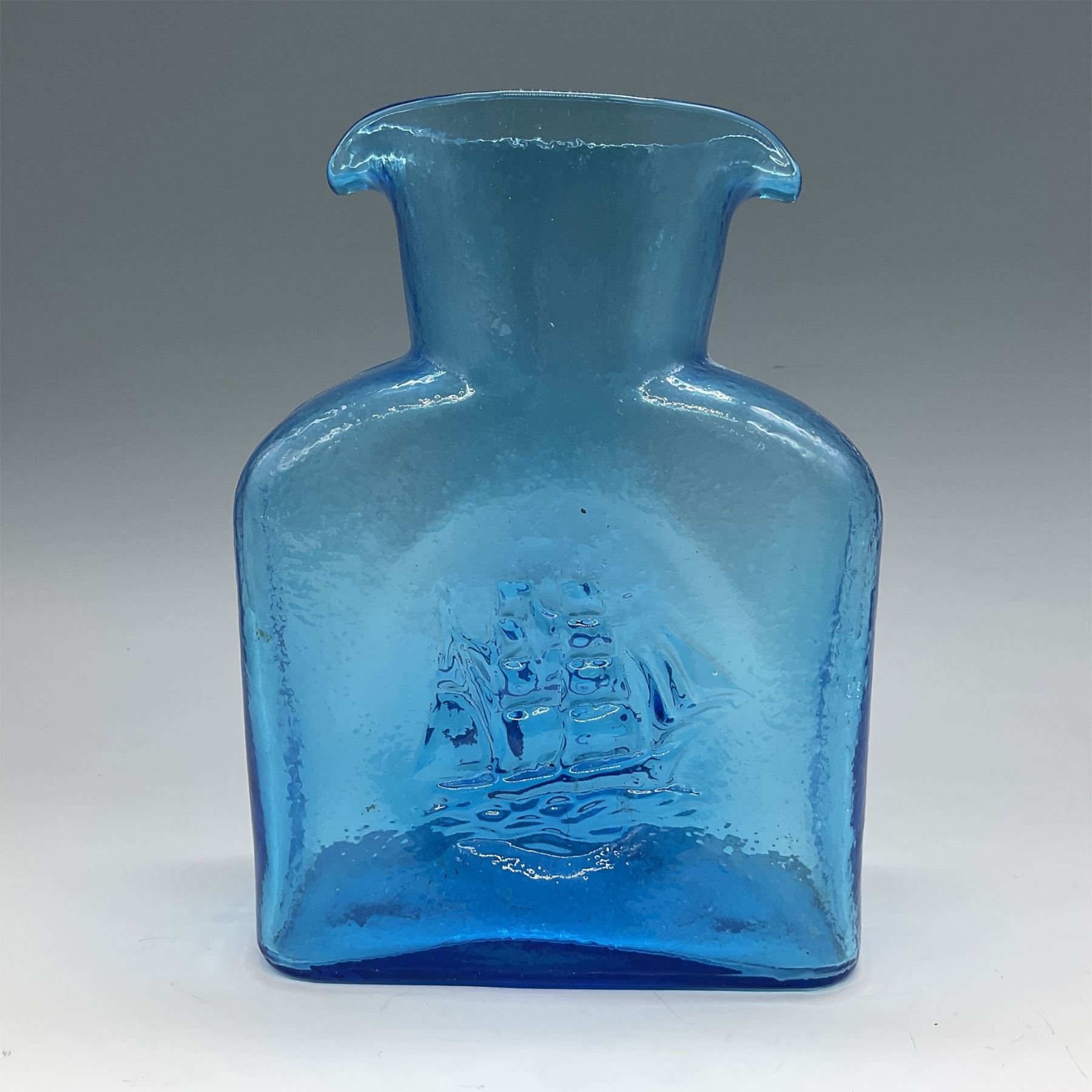 Blenko blue art glass vase featuring a rectangular form with a gracefully curved spout and an embossed sailing ship detail on the front and back. This piece showcases Blenko’s signature mid-century craftsmanship, celebrated for its vibrant colors and artistic textures. A classic example of American hand-blown glasswork, it’s a collectible piece that adds charm to any decor.