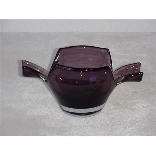 1959 Blenko Bowl, 4 1/4" tall, 9" long, Lilac body with clear base, pontil, signed on base, designed by Wayne Husted, model #5924. Condition is very good, no chips or cracks. (3)