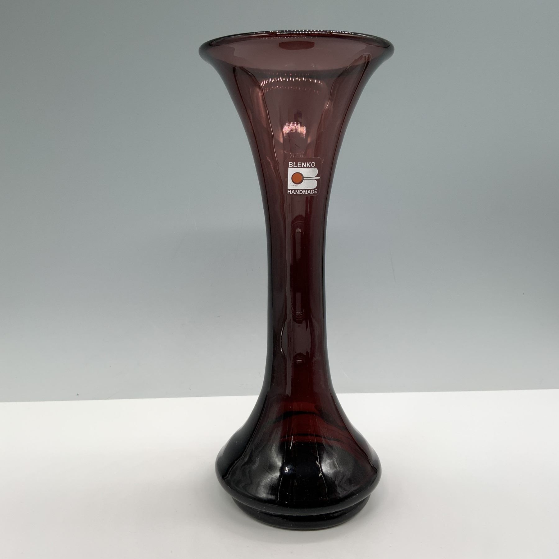 This exquisite Blenko handmade glass vase features a stunning gradient design, transitioning from a deep dark amethyst at the base to a lighter hue towards the top. The sleek, sculptural form reflects Blenko's craftsmanship and dedication to vibrant, dynamic color choices. Marked with the Blenko label, this piece is a genuine example of mid-century modern glass art. In excellent condition, it would make a remarkable addition to any fine glass collection.