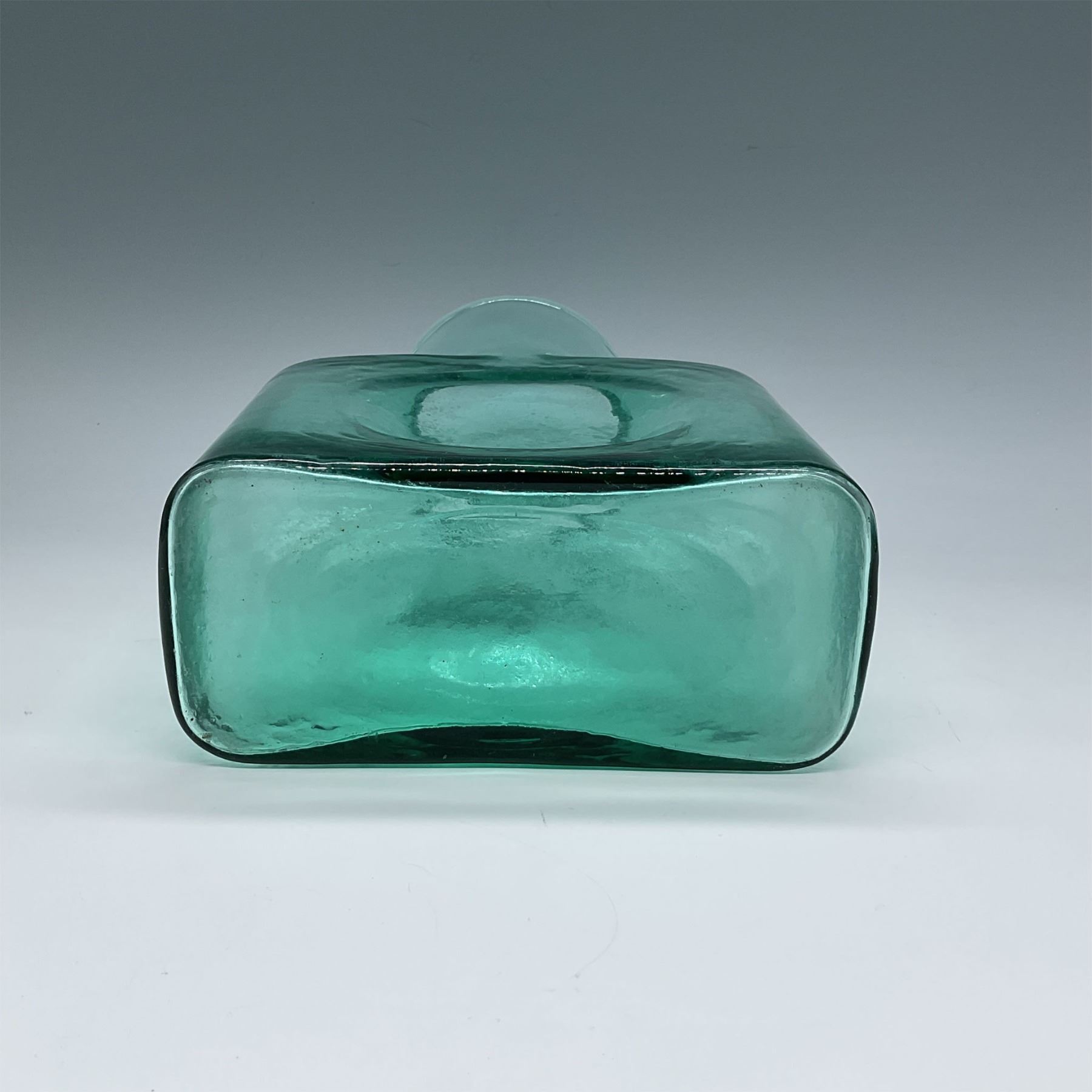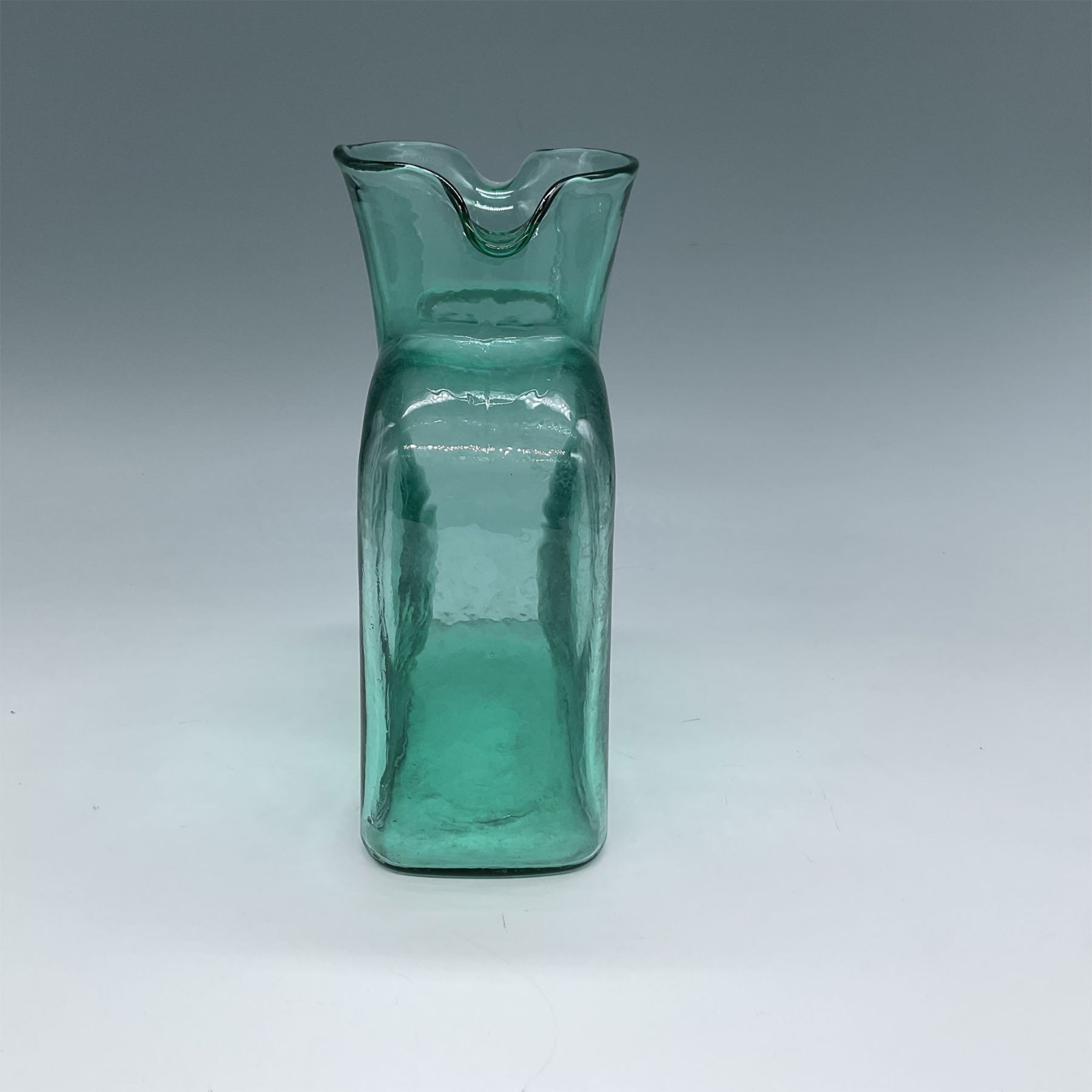 Blenko emerald green glass vase featuring a squared form with a wavy flared rim. This hand-blown art glass piece exemplifies Blenko's renowned craftsmanship and vibrant color palette, a hallmark of mid-century modern design.