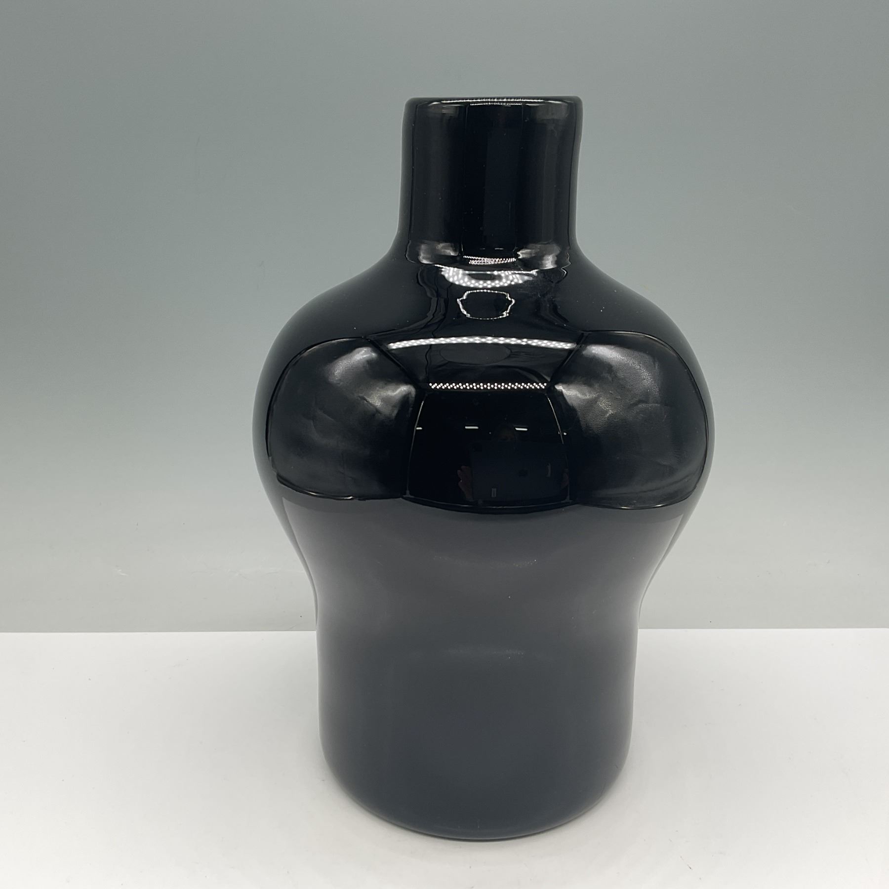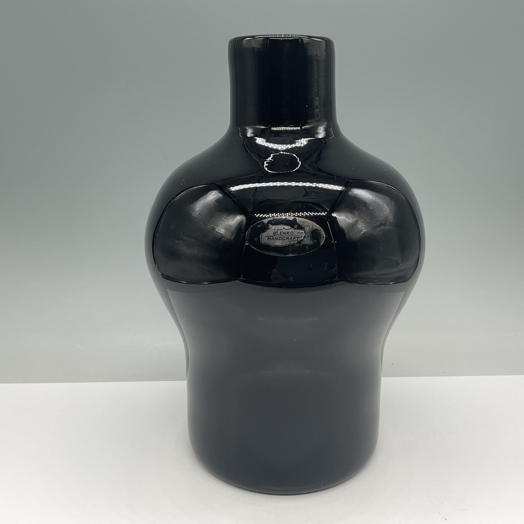 Elegant Blenko Handcraft art glass vase in a striking glossy black finish. This handcrafted piece features a bulbous lower body tapering to a narrow neck. Marked on the base with Blenko 7008 and retains its original Blenko sticker. Known for their high-quality, handmade glass pieces, Blenko Glass Company is an iconic American glassmaker celebrated for their innovative designs and craftsmanship. This vase is an exemplary piece for collectors of modern glass art.