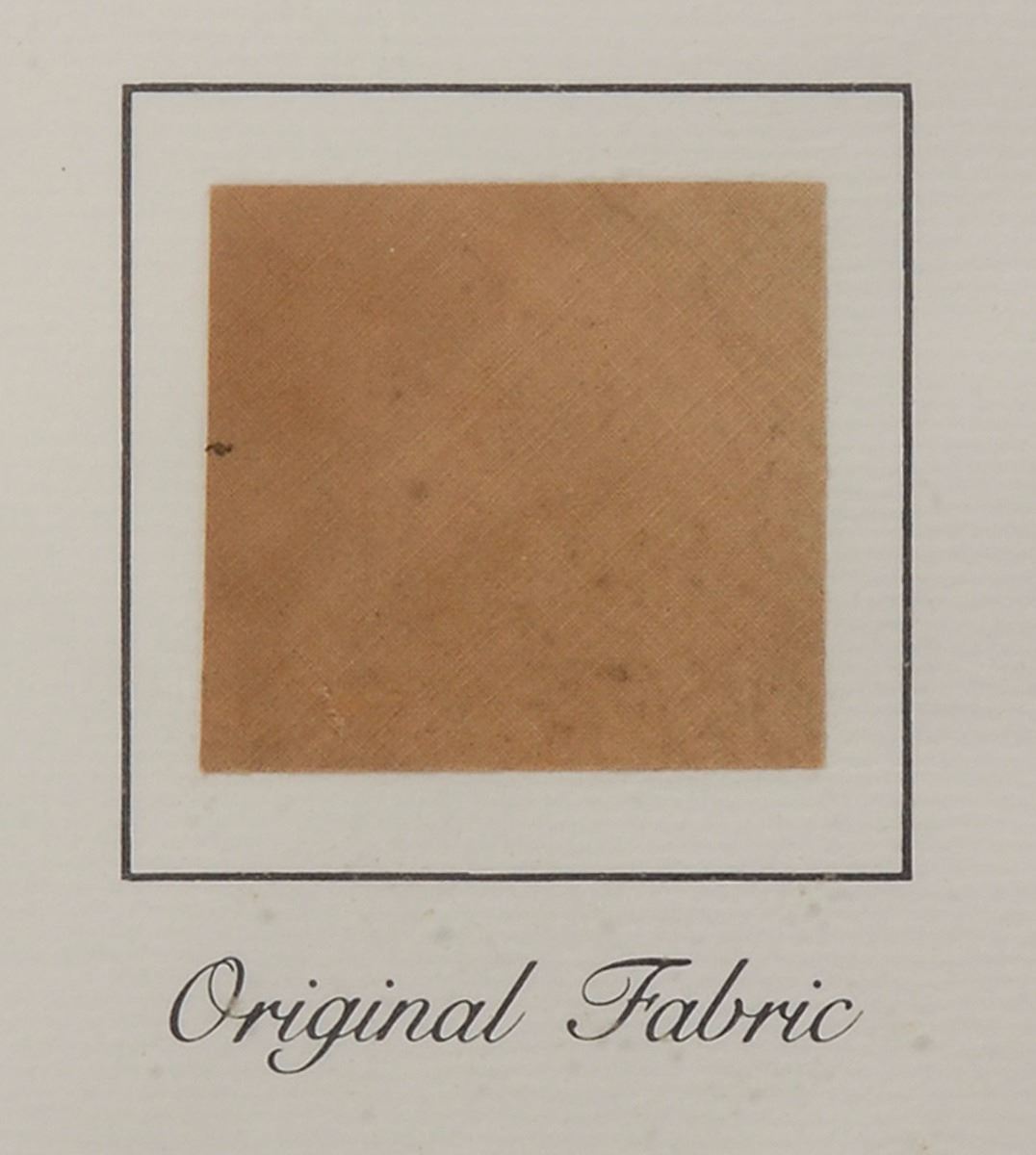 Flown fabric presentation created by the Smithsonian Institution featuring an affixed beige 2 x 2 swatch of wing fabric removed from the Bleriot XI. Framed to an overall size of 16 x 21. In fine condition.