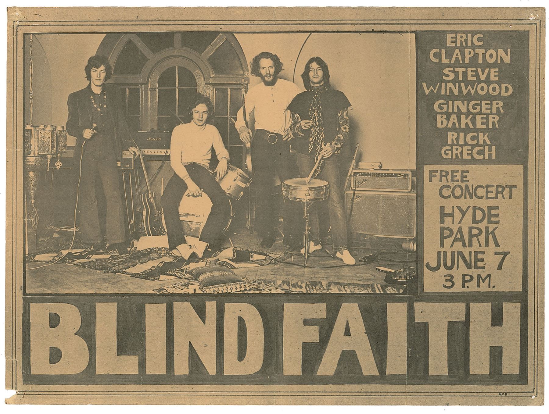 Original 11.5 x 8.5 handbill mini poster promoting a free Blind Faith concert at London's Hyde Park on June 7, [1969], at 3 p.m., showing a group image of the band in a rehearsal room and listing the band member names in the upper right. In very good condition, with intersecting folds, and tack holes to the corners. Accompanied by a certificate of authenticity from Tracks.