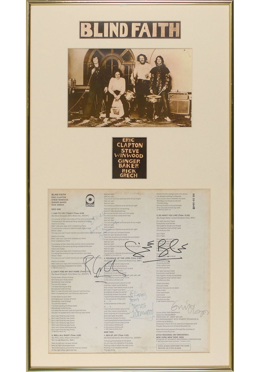 Self-titled album signed on the back cover in black ballpoint by Eric Clapton (with an uncommon full signature), in black felt tip by Ginger Baker and Rick Grech, and signed and inscribed in blue felt tip by Steve Winwood. Album also bears a signature and inscription, “To Steve from Jim,” possibly the album’s producer, Jimmy Miller, who is most likely inscribing to Steve Winwood. Research indicates that these signatures were acquired in person at the Houston Music Hall by the late Larry Lent, a journalist in Houston from 1969-1991. Matted and framed with a group photo and a small caption to an overall size of 15.25 x 27.25. In fine condition, with some scattered light soiling and edge wear. A scarce and extremely desirable classic rock piece. Oversized.