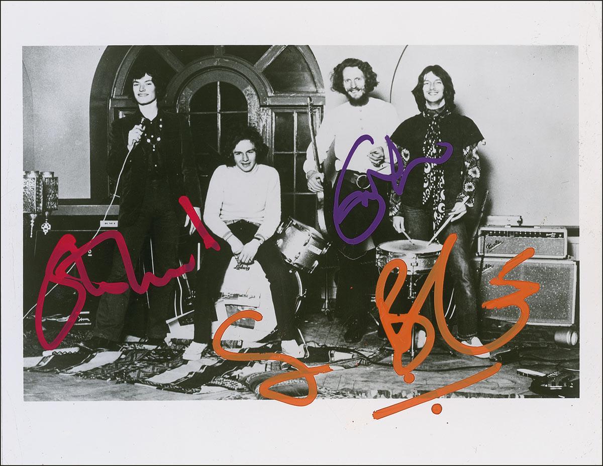 Glossy 10 x 8 group photo, signed in various color ink by Eric Clapton, Ginger Baker, and Steve Winwood. In fine condition, with some scattered light creases and surface marks. Pre-certified Roger Epperson/REAL and RRAuction COA.