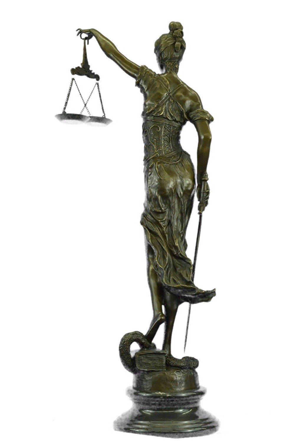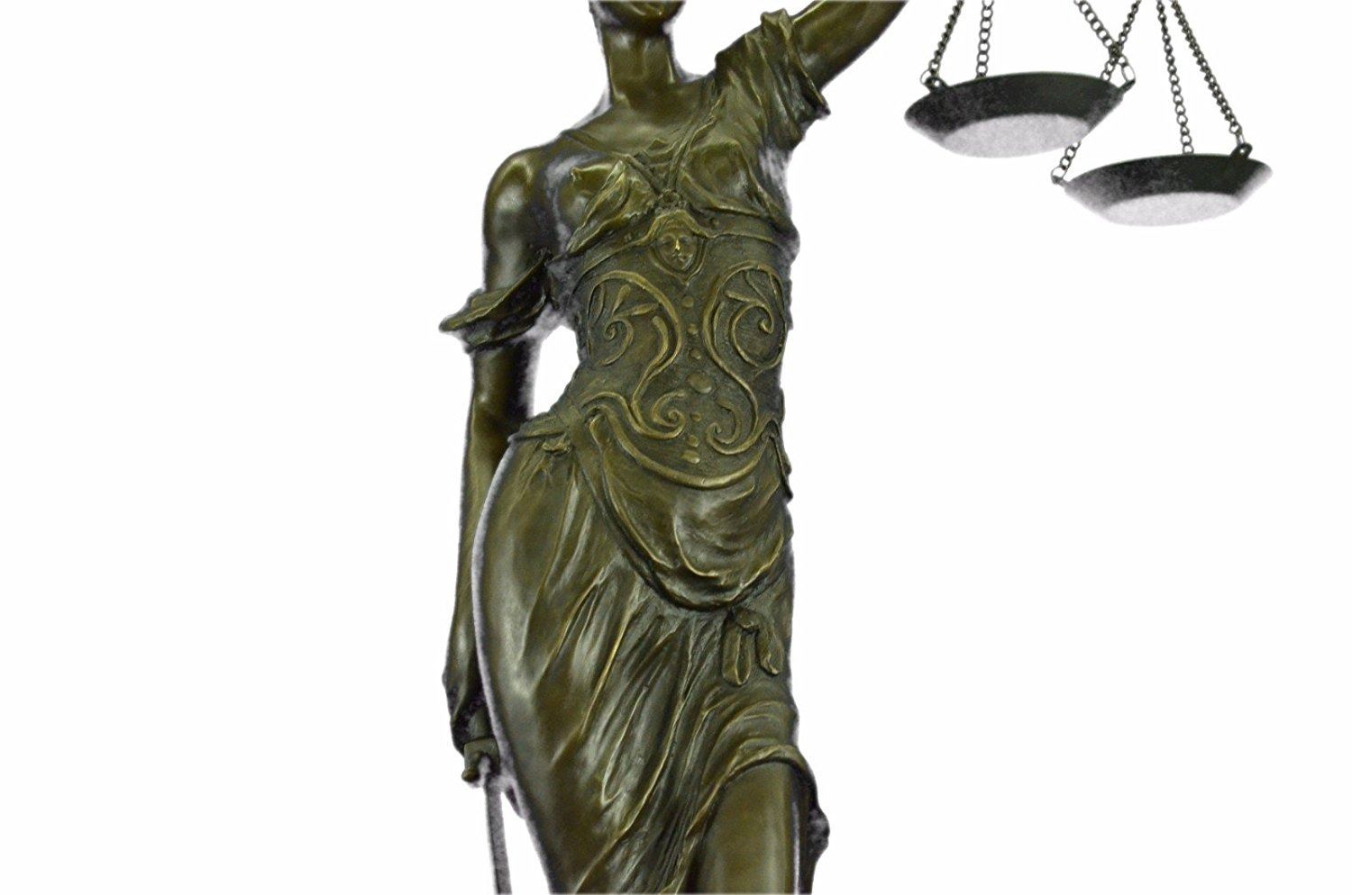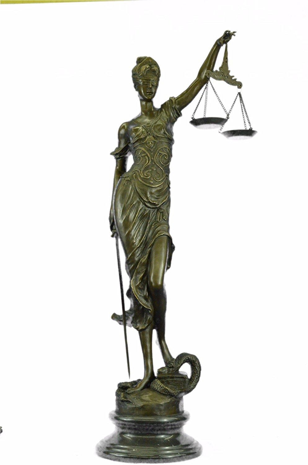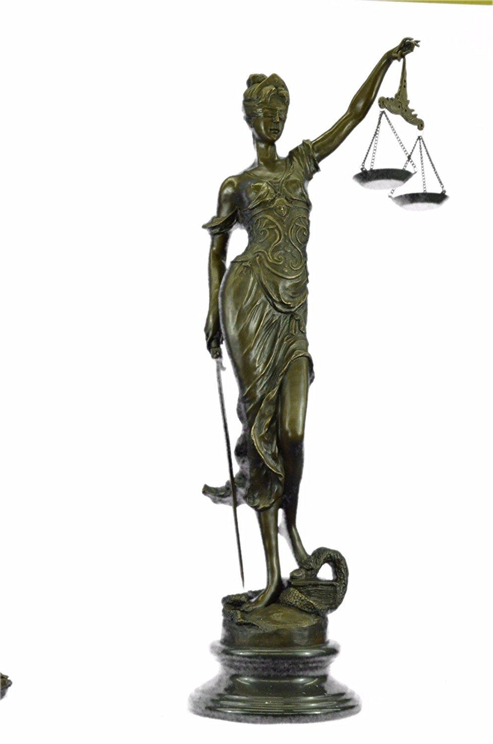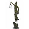 The bronze sculpture is of Lady Justice Roman goddess of Justice who is the symbolic personification of the moral force in judicial systems. As anciently depicted, the blindfolded Lady Justice, is seen balancing the scales of truth and fairness from her left hand, holding a sword, while stepping on a book and a snake that coils around her feet. The scales, represent truth and fairness and measures the strength of a case's support and opposition. The blindfold, represents objectivity, in that justice is (or should be) meted out objectively without biases. The sword, symbolizes the power of reason and justice, which may be wielded either for or against any party. The book represents history; signifying to stand against wrongdoings or with the good doings of the past. The snake symbolizes hatred hence the foot that stops it from getting its grip. She was captured using the ageold method of lostwax casting and stained with a brown patina finish. Bronze Dimensions with Marble Base: Height 39 X Width 18 inches. Weight: 55 LBS. Inventory: 32EP26031023