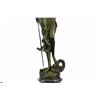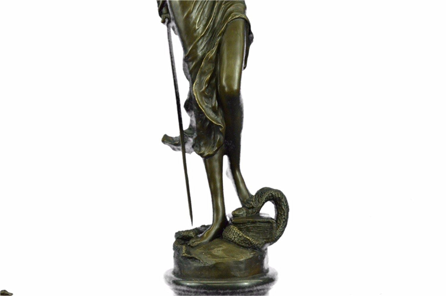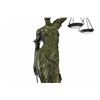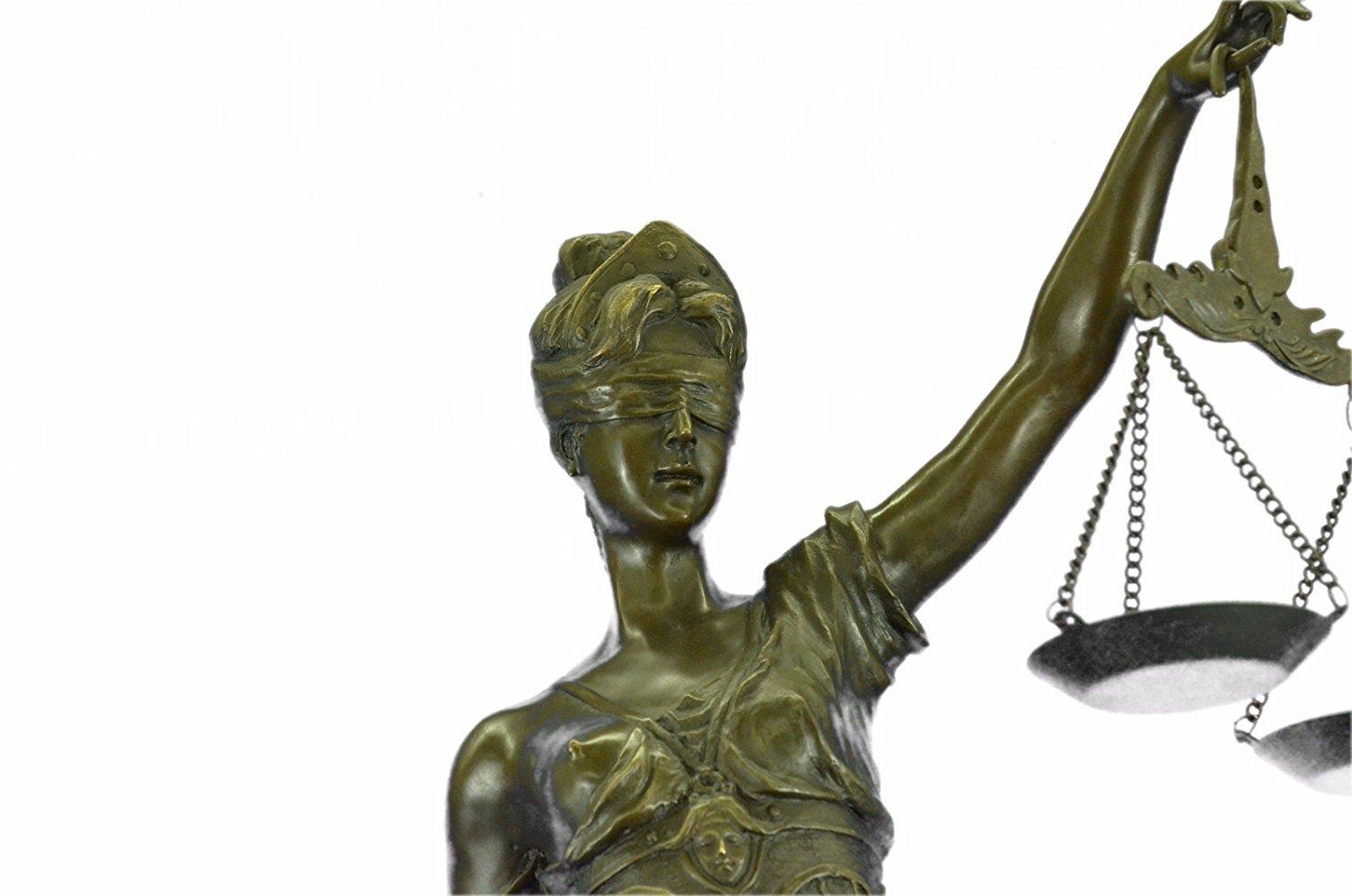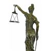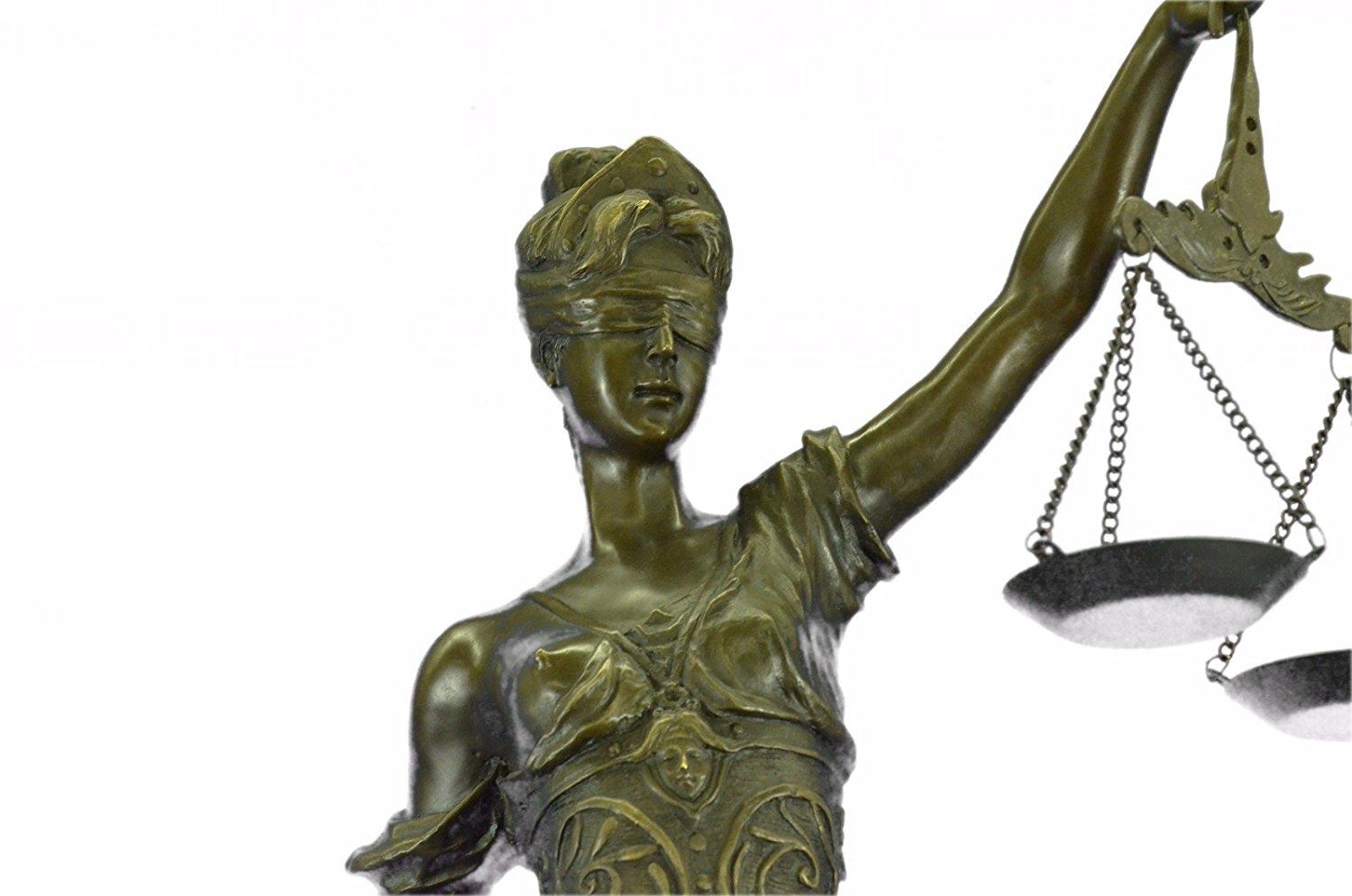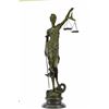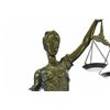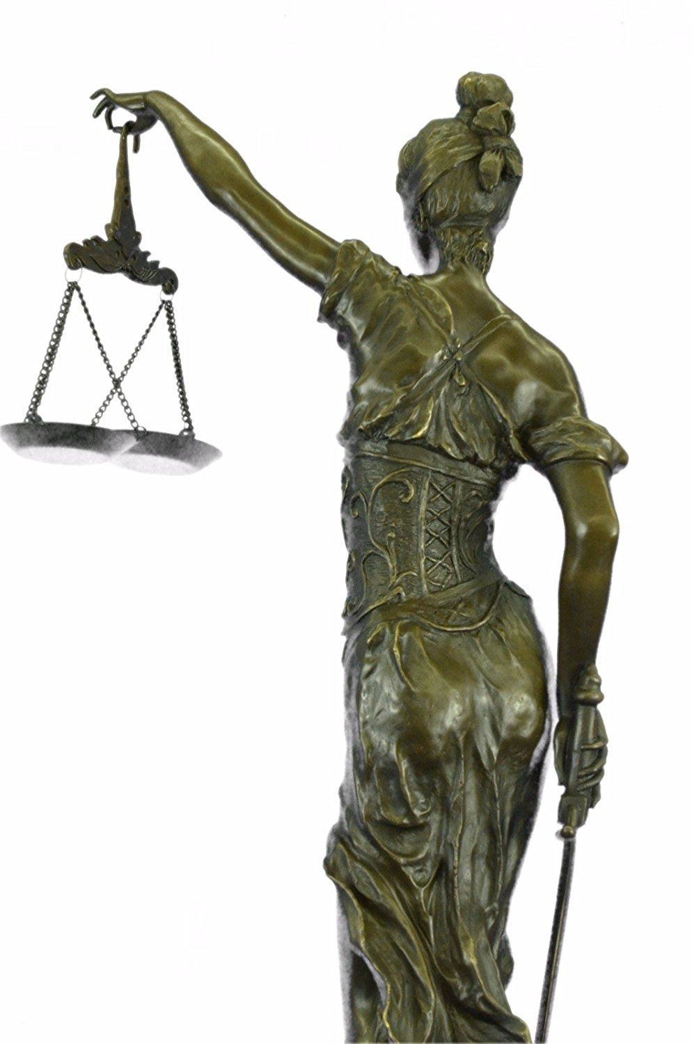 The bronze sculpture is of Lady Justice Roman goddess of Justice who is the symbolic personification of the moral force in judicial systems. As anciently depicted, the blindfolded Lady Justice, is seen balancing the scales of truth and fairness from her left hand, holding a sword, while stepping on a book and a snake that coils around her feet. The scales, represent truth and fairness and measures the strength of a case's support and opposition. The blindfold, represents objectivity, in that justice is (or should be) meted out objectively without biases. The sword, symbolizes the power of reason and justice, which may be wielded either for or against any party. The book represents history; signifying to stand against wrongdoings or with the good doings of the past. The snake symbolizes hatred hence the foot that stops it from getting its grip. She was captured using the ageold method of lostwax casting and stained with a brown patina finish. Bronze Dimensions with Marble Base: Height 39 X Width 18 inches. Weight: 55 LBS. Inventory: 32EP26031023