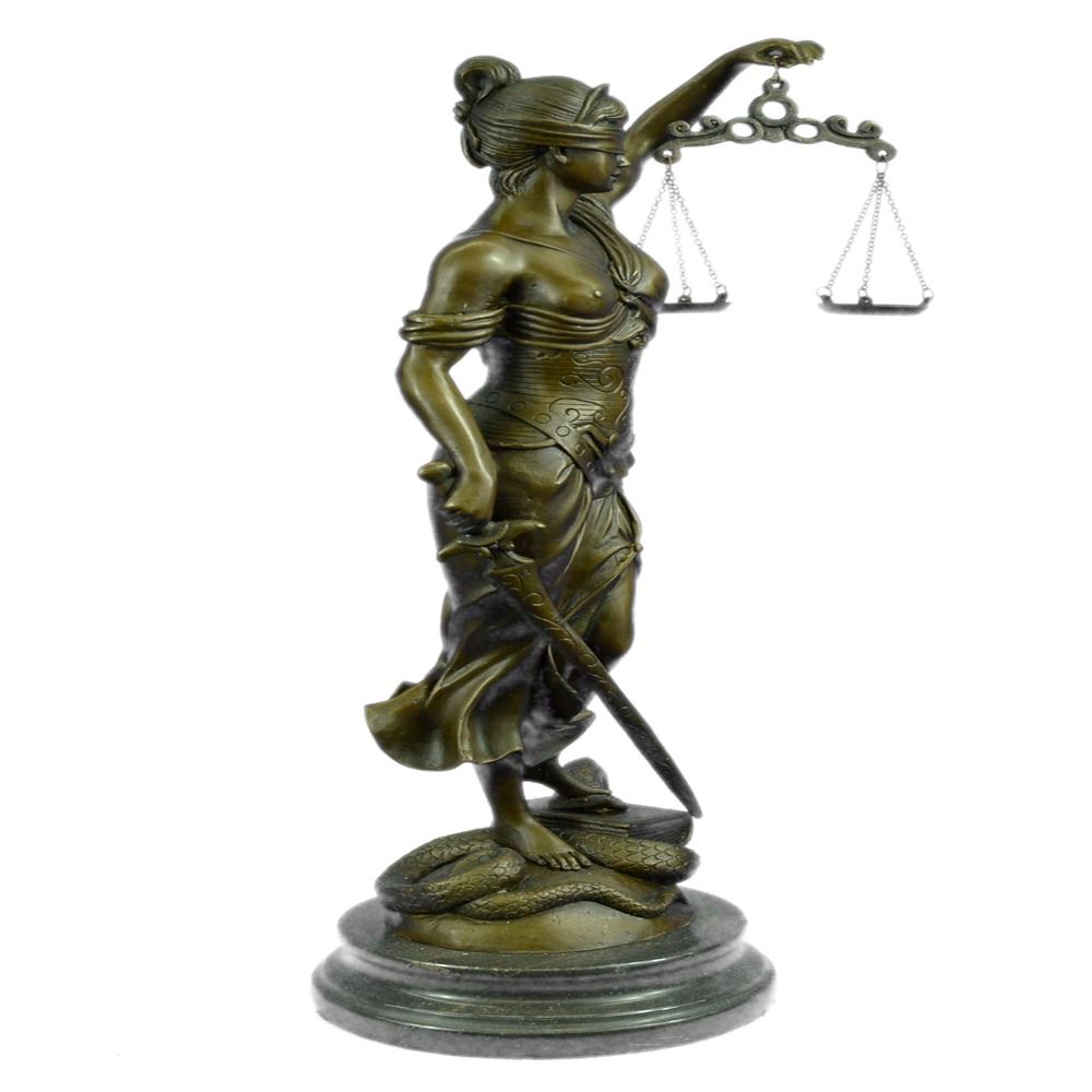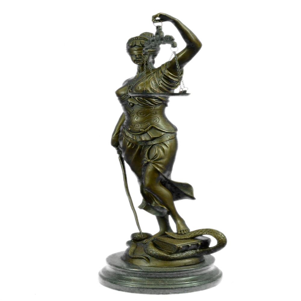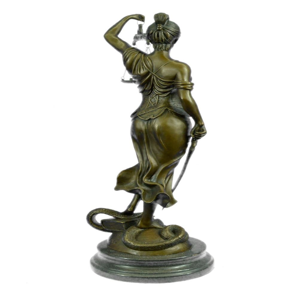 The bronze sculpture is of Lady Justice Roman goddess of Justice who is the symbolic personification of the moral force in judicial systems. As anciently depicted, the blindfolded Lady Justice, is seen balancing the scales of truth and fairness from her left hand, holdings sword, while stepping on a book and a snake that coils around her feet. The scales, represent truth and fairness and measures the strength of a case support and opposition. The blindfold, represents objectivity, in that justice is or should be meted out objectively without biases. The sword, symbolizes the power of reason and justice,which may be wielded either for or against any party. The book represents history, signifying to stand against wrongdoings or with the good doings of the past. The snake symbolizes hatred hence the foot that stops it from getting its grip. She was captured using the age old method of lost wax casting and stained with a brown patina finish and is mounted upon a marble base. Bronze Dimensions with Marble Base: Height 19 X Width 8 inches. Weight: 13 LBS.