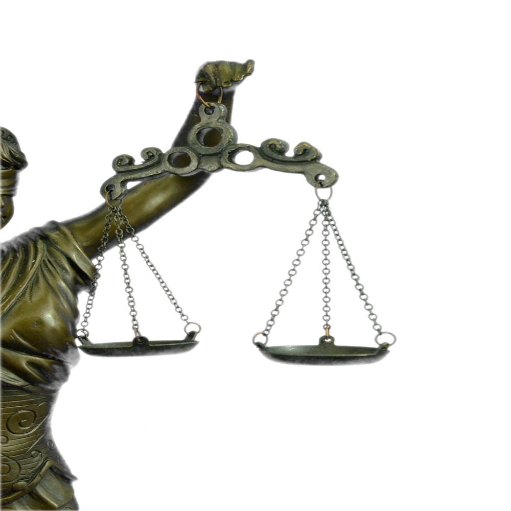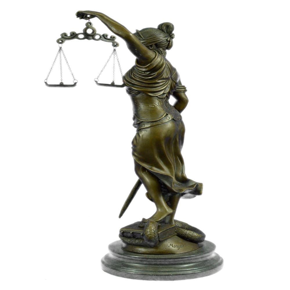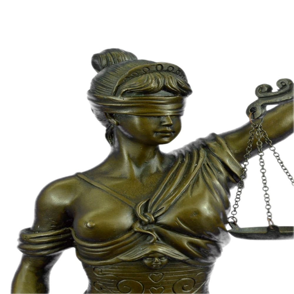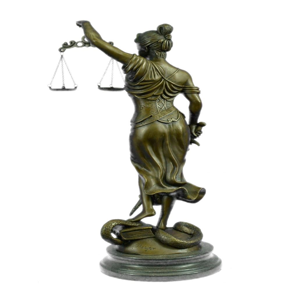 The bronze sculpture is of Lady Justice Roman goddess of Justice who is the symbolic personification of the moral force in judicial systems. As anciently depicted, the blindfolded Lady Justice, is seen balancing the scales of truth and fairness from her left hand, holdings sword, while stepping on a book and a snake that coils around her feet. The scales, represent truth and fairness and measures the strength of a case support and opposition. The blindfold, represents objectivity, in that justice is or should be meted out objectively without biases. The sword, symbolizes the power of reason and justice,which may be wielded either for or against any party. The book represents history, signifying to stand against wrongdoings or with the good doings of the past. The snake symbolizes hatred hence the foot that stops it from getting its grip. She was captured using the age old method of lost wax casting and stained with a brown patina finish and is mounted upon a marble base. Bronze Dimensions with Marble Base: Height 19 X Width 8 inches. Weight: 13 LBS.