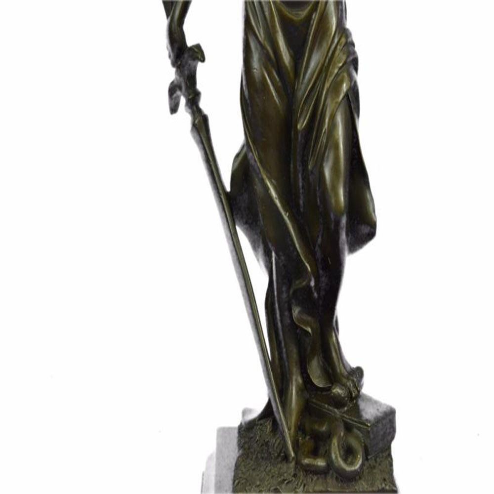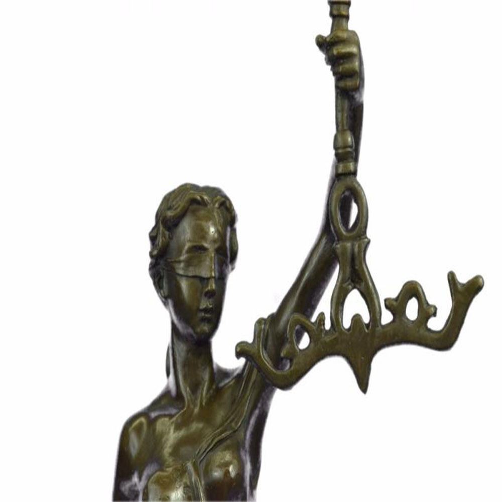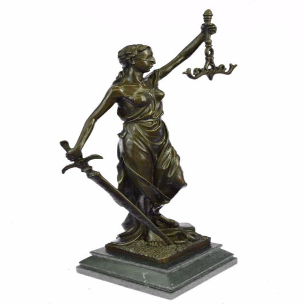 The bronze sculpture is of Lady Justice Roman goddess of Justice who is the symbolic personification of the moral force in judicial systems. As anciently depicted, the blindfolded Lady Justice, is seen balancing the scales of truth and fairness from her left hand, holding a sword, while stepping on a book and a snake that coils around her feet. The scales, represent truth and fairness and measures the strength of a case support and opposition. The blindfold, represents objectivity, in that justice is or should be meted out objectively without biases. The sword, symbolizes the power of reason and justice, which may be wielded either for or against any party. The book represents history, signifying to stand against wrongdoings or with the good doings of the past. The snake symbolizes hatred hence the foot that stops it from getting its grip. She was captured using the age old method of lost wax casting and stained with a brown patina finish and is mounted upon a marble base. Bronze Dimensions with Marble Base: Height 17 X Width 10 inches. Weight: 10 LBS.