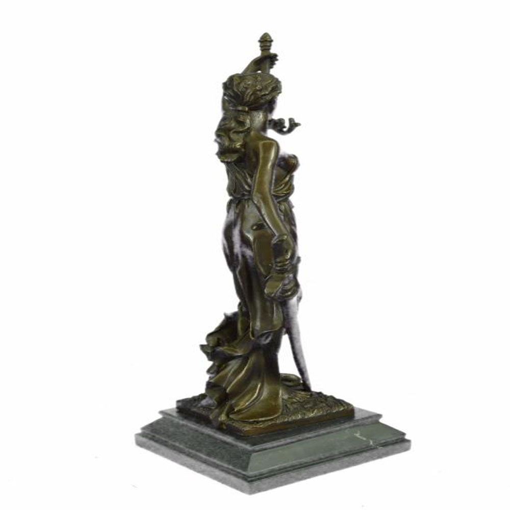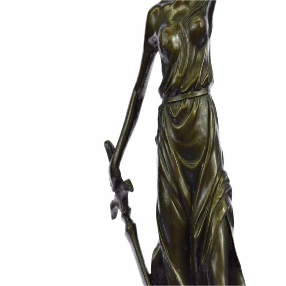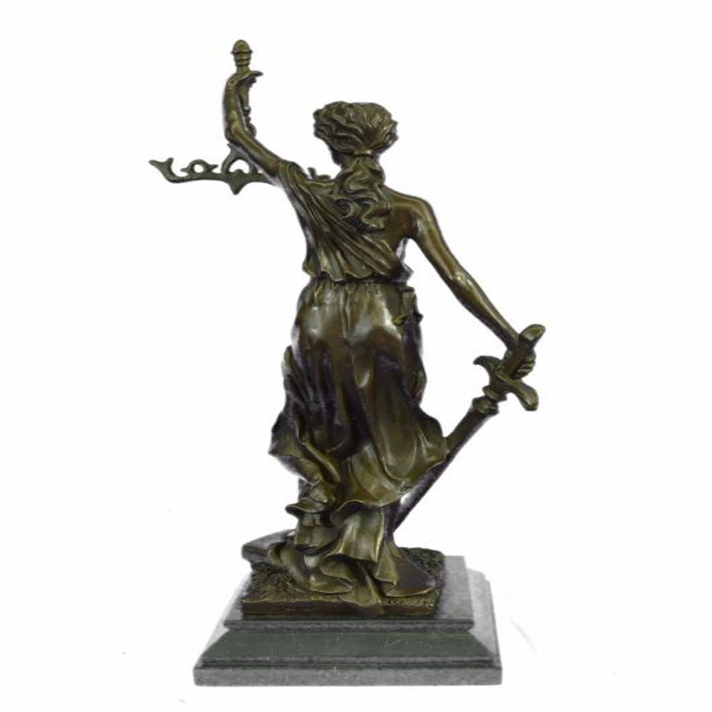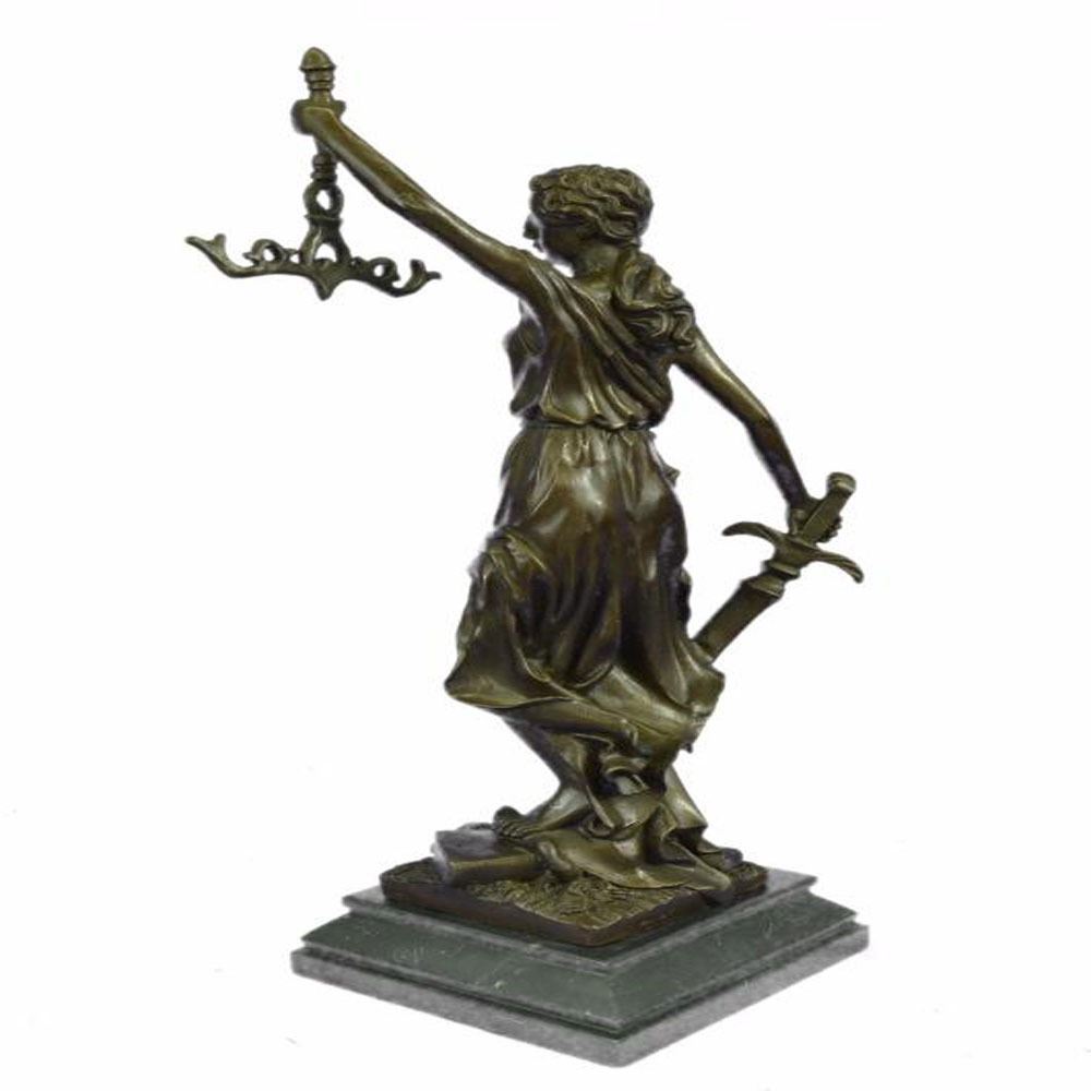 The bronze sculpture is of Lady Justice Roman goddess of Justice who is the symbolic personification of the moral force in judicial systems. As anciently depicted, the blindfolded Lady Justice, is seen balancing the scales of truth and fairness from her left hand, holding a sword, while stepping on a book and a snake that coils around her feet. The scales, represent truth and fairness and measures the strength of a case support and opposition. The blindfold, represents objectivity, in that justice is or should be meted out objectively without biases. The sword, symbolizes the power of reason and justice, which may be wielded either for or against any party. The book represents history, signifying to stand against wrongdoings or with the good doings of the past. The snake symbolizes hatred hence the foot that stops it from getting its grip. She was captured using the age old method of lost wax casting and stained with a brown patina finish and is mounted upon a marble base. Bronze Dimensions with Marble Base: Height 17 X Width 10 inches. Weight: 10 LBS.