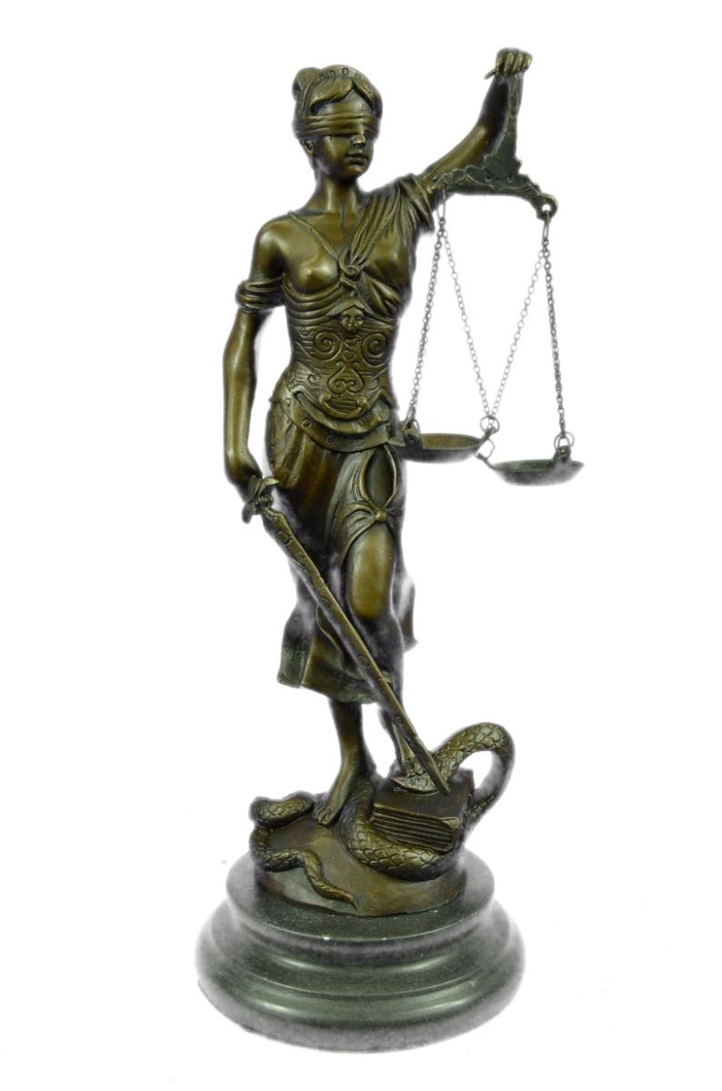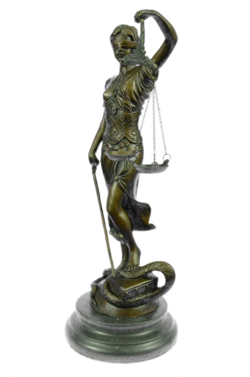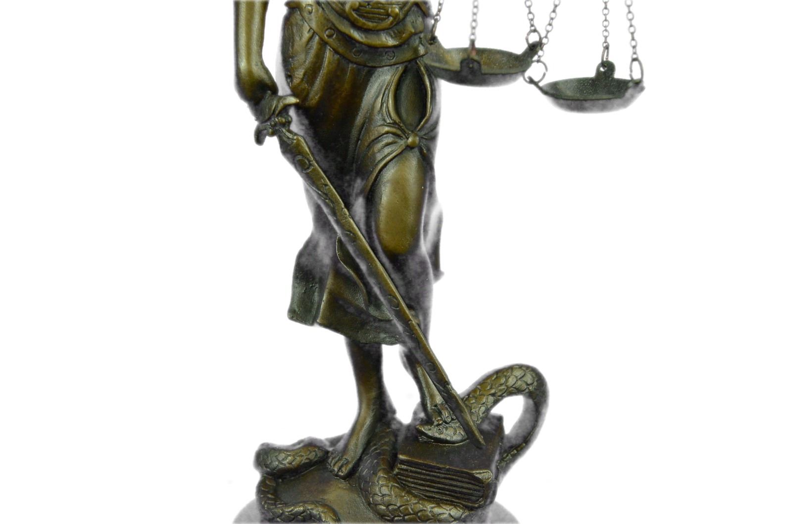 Lady Justice And Blind Justice Are The Names Associated With The Feminine Image Themis, The Goddess Of Greek Mythology Epitomizing The Virtue Of Justice. She Holds The "Sword Of Truth" In One Hand To Represent Power And Lifts Her Scales In The Other, Displaying Impartiality. She Is Blindfolded To Assure Fairness In Judgment, Which Calls To The Old Sacred Ideals Of Law Practices. She Stands Barefoot On The Book Of Law, While A Snake Coils At Her Feet. She Is A Brown Patina But Her Dress Is A Light Green And. This Would Make A Great Inspiring Gift For Lawyers, Judges, Anyone Who Aspires To Work In Law. 100% Bronze And Handmade, This Sculpture Was Cast Using The "Lost Wax Method". Bronze Dimensions With Marble Base: Height 11 X Width 4 inches. Weight: 5 Lbs.