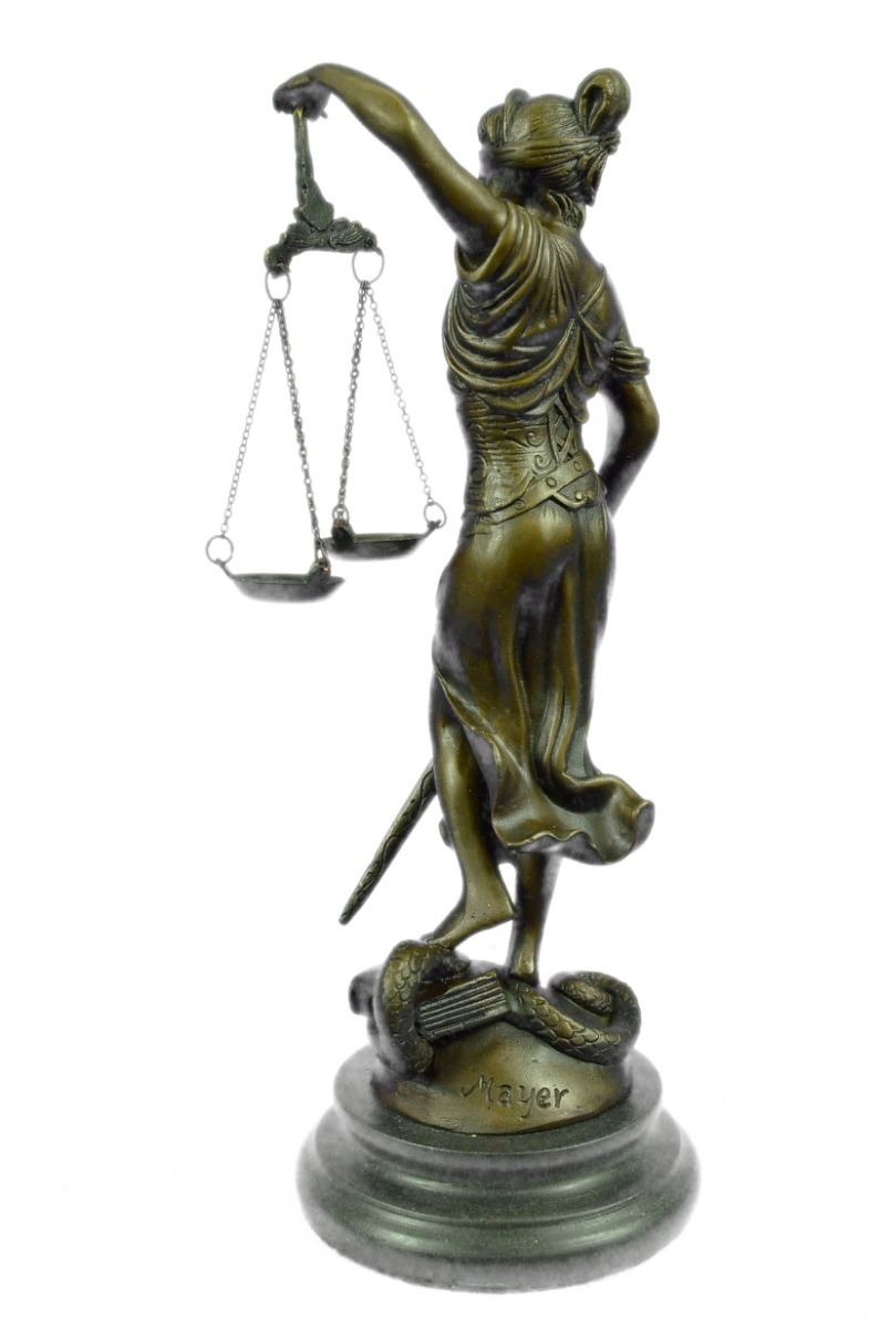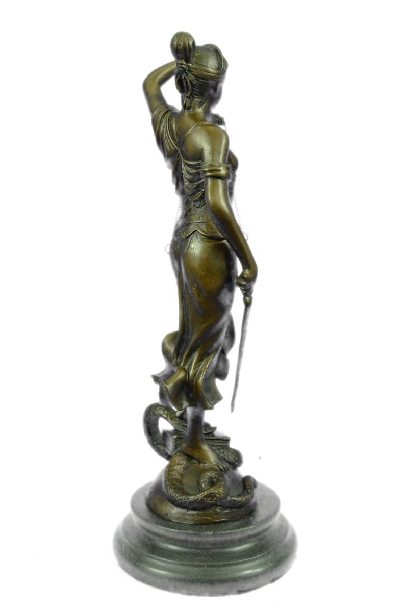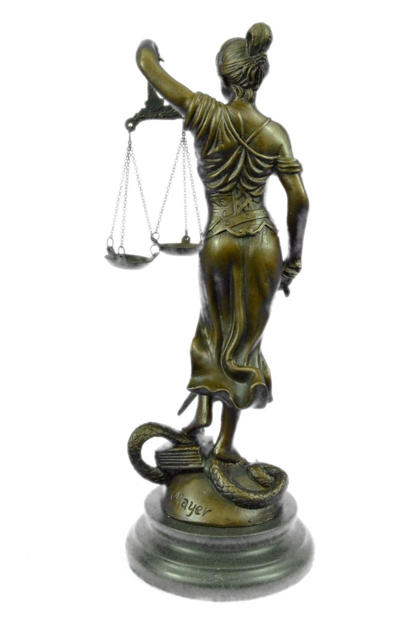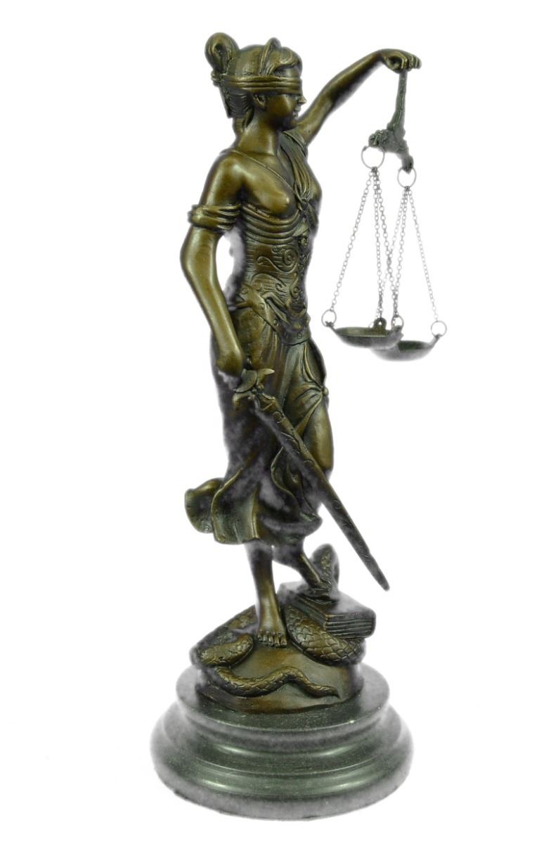 Lady Justice And Blind Justice Are The Names Associated With The Feminine Image Themis, The Goddess Of Greek Mythology Epitomizing The Virtue Of Justice. She Holds The "Sword Of Truth" In One Hand To Represent Power And Lifts Her Scales In The Other, Displaying Impartiality. She Is Blindfolded To Assure Fairness In Judgment, Which Calls To The Old Sacred Ideals Of Law Practices. She Stands Barefoot On The Book Of Law, While A Snake Coils At Her Feet. She Is A Brown Patina But Her Dress Is A Light Green And. This Would Make A Great Inspiring Gift For Lawyers, Judges, Anyone Who Aspires To Work In Law. 100% Bronze And Handmade, This Sculpture Was Cast Using The "Lost Wax Method". Bronze Dimensions With Marble Base: Height 11 X Width 4 inches. Weight: 5 Lbs.