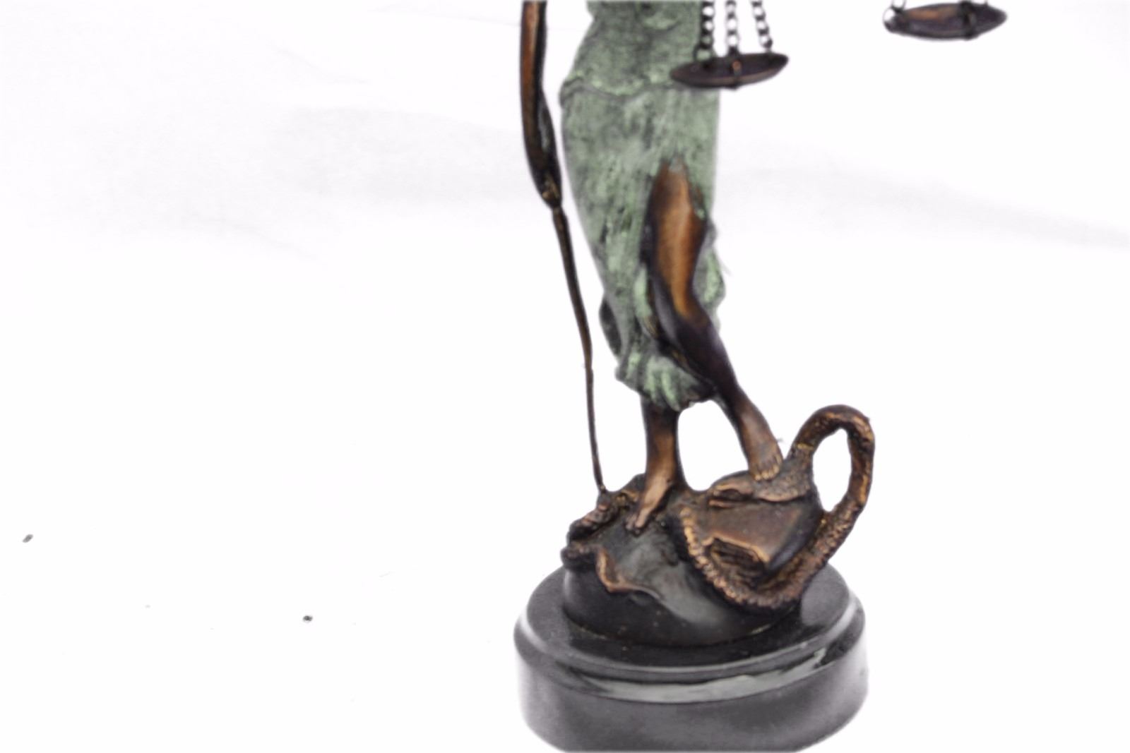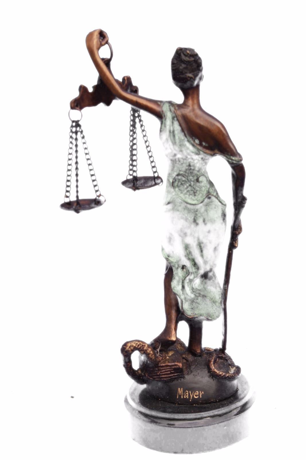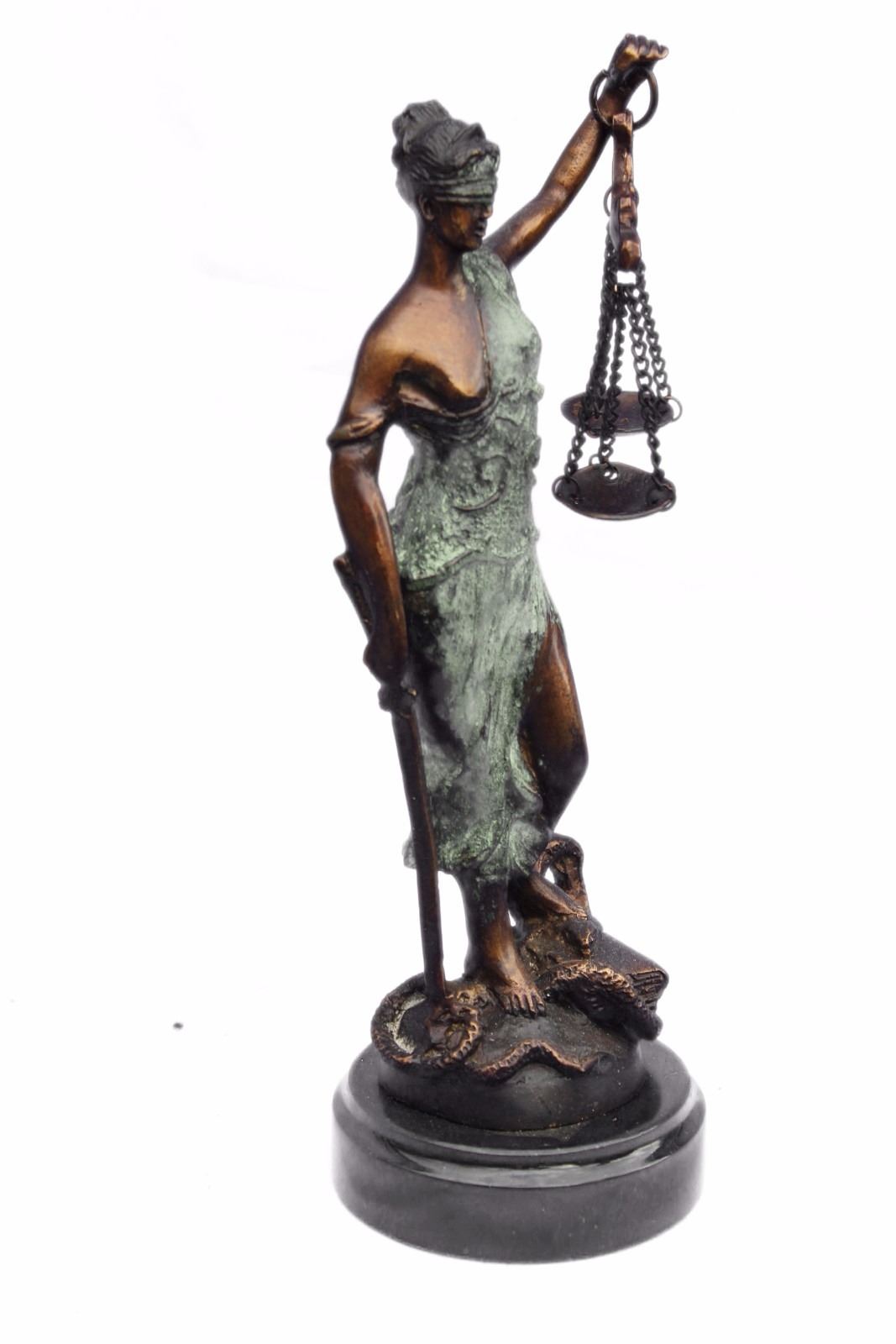 Lady Justice and Blind Justice are the names associated with the feminine image Themis, the goddess of Greek Mythology epitomizing the virtue of Justice. She holds the Sword of Truth in one hand to represent power and lifts her scales in the other, displaying impartiality. She is blindfolded to assure fairness in judgment, which calls to the old sacred ideals of law practices. She stands barefoot on the book of law, while a snake coils at her feet. She is a brown patina but her dress is a light green and. This would make a great inspiring gift for lawyers, judges, anyone who aspires to work in law. 100% bronze and handmade, this sculpture was cast using the Lost Wax Method. Bronze Dimensions with Marble Base: Height 10 X Width 6 inches. Weight: 5 LBS. Inventory: 14-54019M41